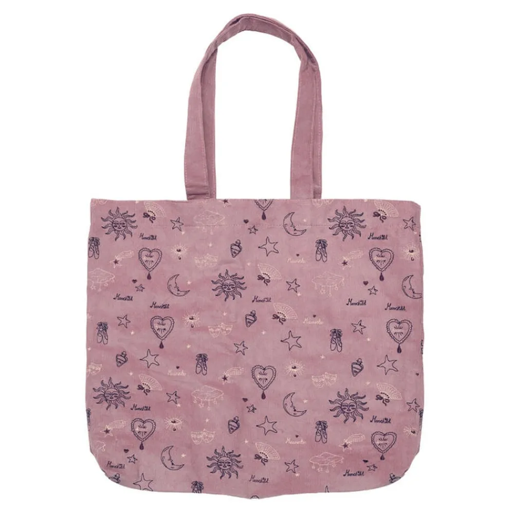 Vores Corduroy Tote Bag forener praktik med elegance med sit mønster af stjerner, hjerter halvmåner og lokkende vifter, der tilsammen giver illusionen af scenens fortryllende sjæl.