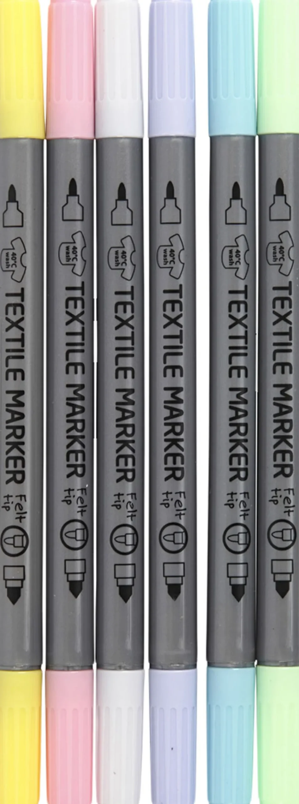 Semidækkende tekstiltuscher med to forskellige filtspidser i hver, som du kan bruge til at dekorere nye og gamle tekstiler med.. Tekstiltuscher er gode til kreative genistreger. Med dem kan du bringe alverdens stof til live med unikke mønstre og søde tegninger – og du kan samtidig gå farve-amok! Tusserne er derfor et sikkert hit i alle aldre, både hos tegnglade voksne og kreative børn. Har du brug for en tynd streg til at tegne og skrive med – eller en tyk streg til at farvelægge med? Med vores tekstil markers fra Colortime får du begge muligheder. Så skal det være nemt at dekorere på tekstil og stof, er denne populære tusch et rigtig godt valg.. Ryst tuschen godt før brug, og læg plast eller pap ind i fx t-shirts og muleposer, så farven ikke smitter af på bagsiden. Når farven er tør, kan du strygefiksere med bagepapir over og under tekstilemnet. Efter strygefiksering holder farverne sig flotte i vask op til 40 grader C. Bemærk, at tuschen er perfekt til lyse tekstiler af bomuld m.m..