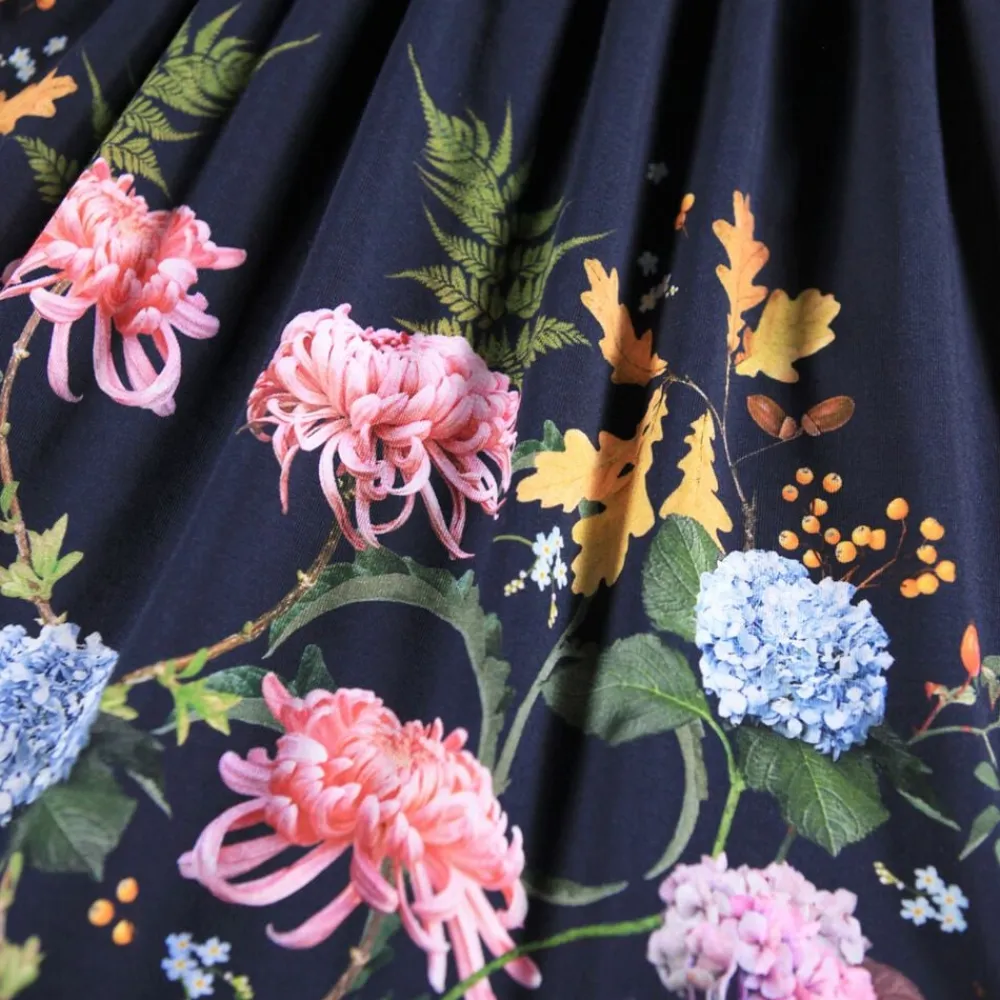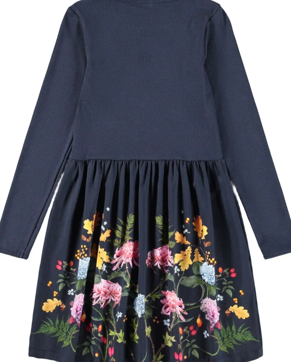 Denne mørkeblå langærmede kjole i økologisk bomuld fra Molo har en tætsiddende rib-jersey overdel og et skørt i glat jersey, der giver plads til leg og bevægelse. Kjolens skørt er prydet med et print af blomster og blade, og den er nem at få på.