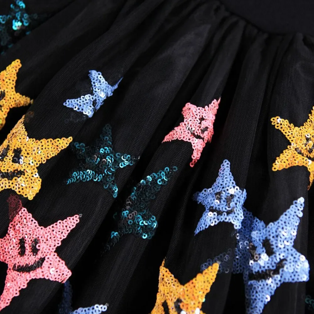 Denne sorte langærmet kjole fra Molo har et matchende tylskørt dekoreret med paillet-stjerner. Toppen er tætsiddende i ribbet bomuldsjersey med rund hals, skørtet går til knæet og har et sort underskørt.