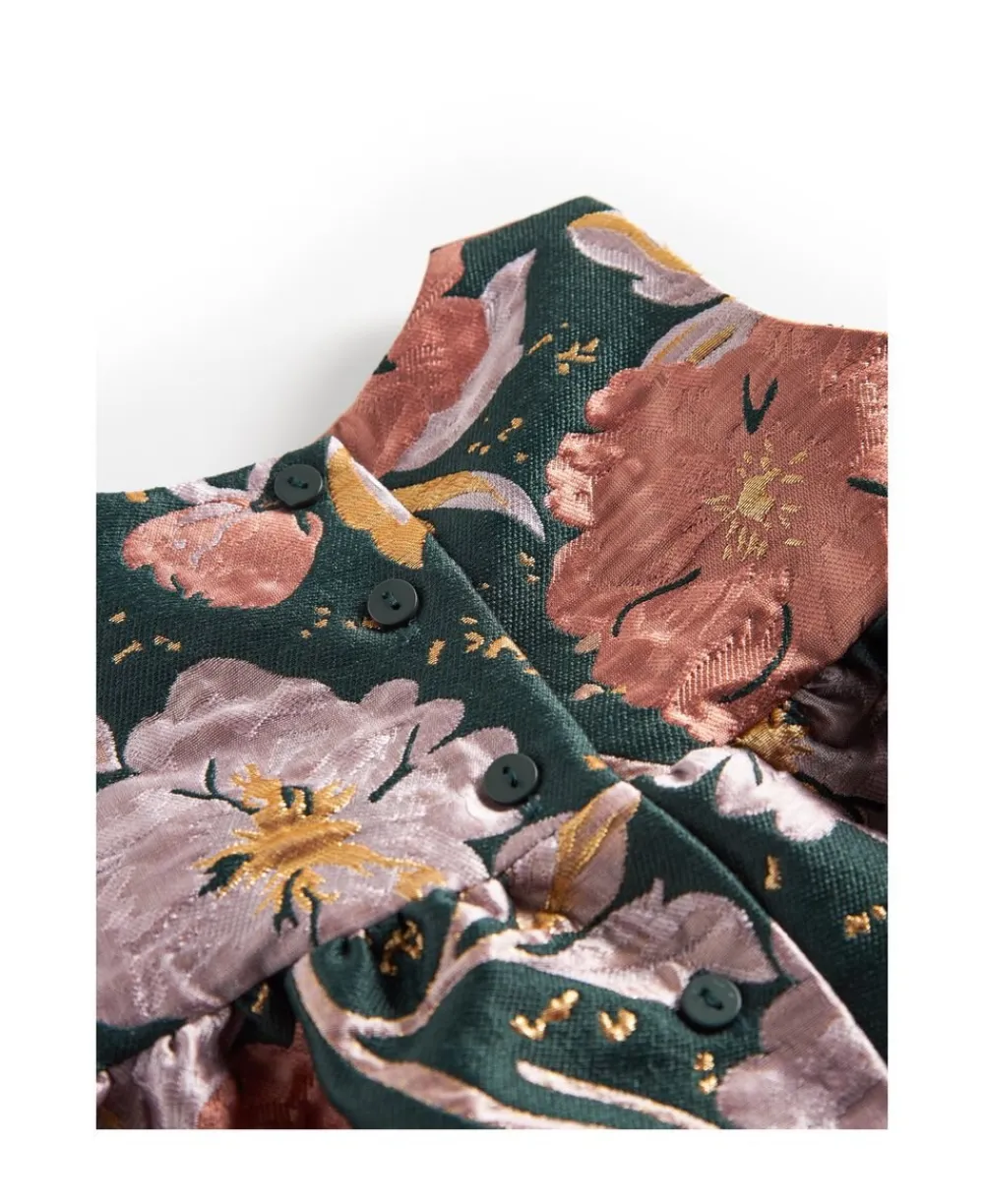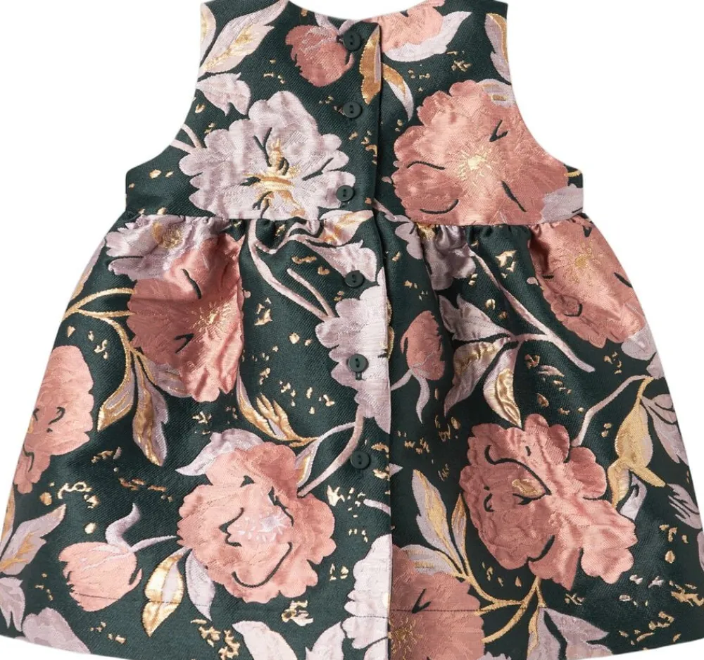 Kortærmet kjole til de små i en eksklusiv jacquard-vævet kvalitet med en elegant tekstur og et delikat blomstermønster. Kjolen lukkes med fine knapper bagpå, hvilket tilføjer et klassisk og raffineret touch samtidig med, at den er nem at tage af og på. Perfekt til både festlige lejligheder og særlige øjeblikke. Kjolens længde går til over knæet.