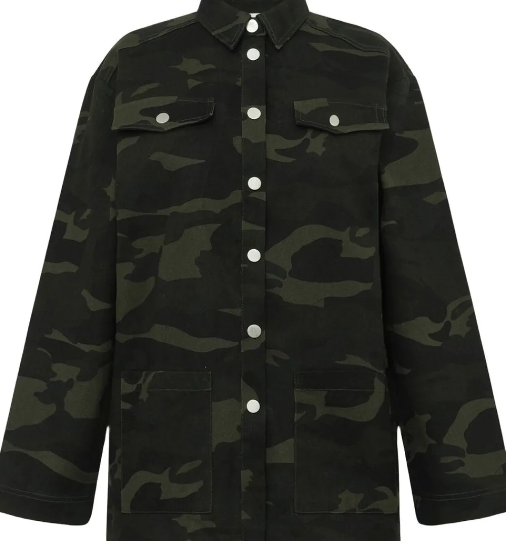 Camo jacket is a camouflage-colored shirt jacket. It has a dark green and black camo pattern, snap button closure in silver color at the front, decorative chest pockets with flap and button, as well as two open pockets at the bottom. The jacket has a straight fit and a traditional shirt collar. The jacket is true to size. – Camo – Shirt collar – Long sleeves Quality: 100% Cotton