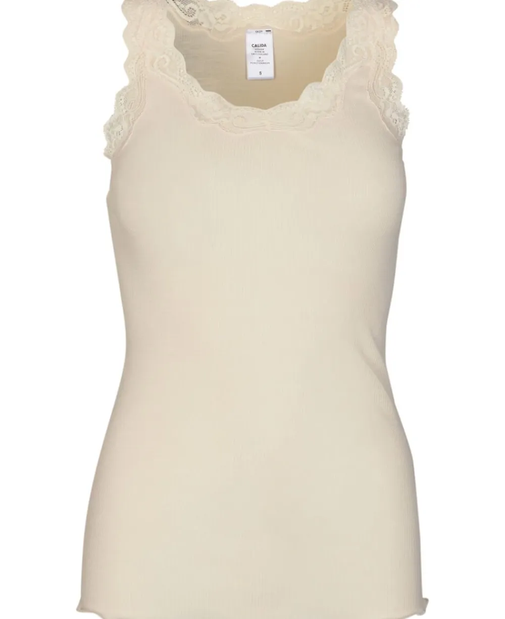 Top fra Calida i den blødeste kvalitet bestående af uld og silke. En kvalitet, der sikrer den optimale komfort. Derudover er toppen enkel i modellen med de fineste blondekanter, en tætsiddende pasform samt en kantsyning, der giver en flot flæseeffekt.