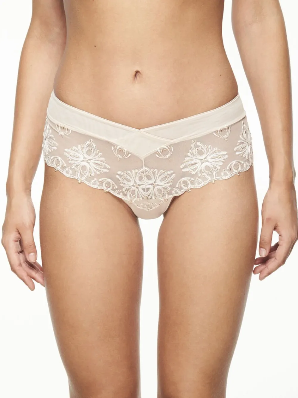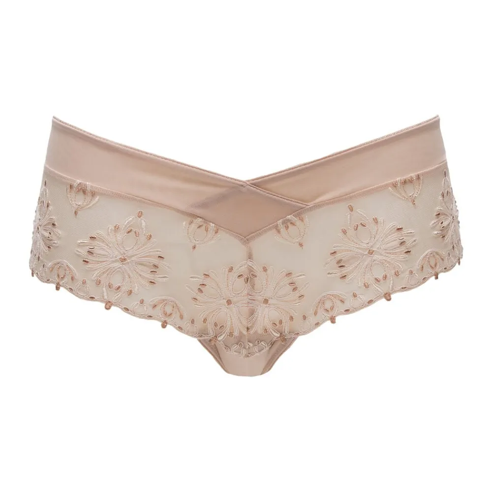 Trusse med elegant broderi og transparente detaljer. Trussen er skåret midt på ballen og fremhæver det forførende udtryk.