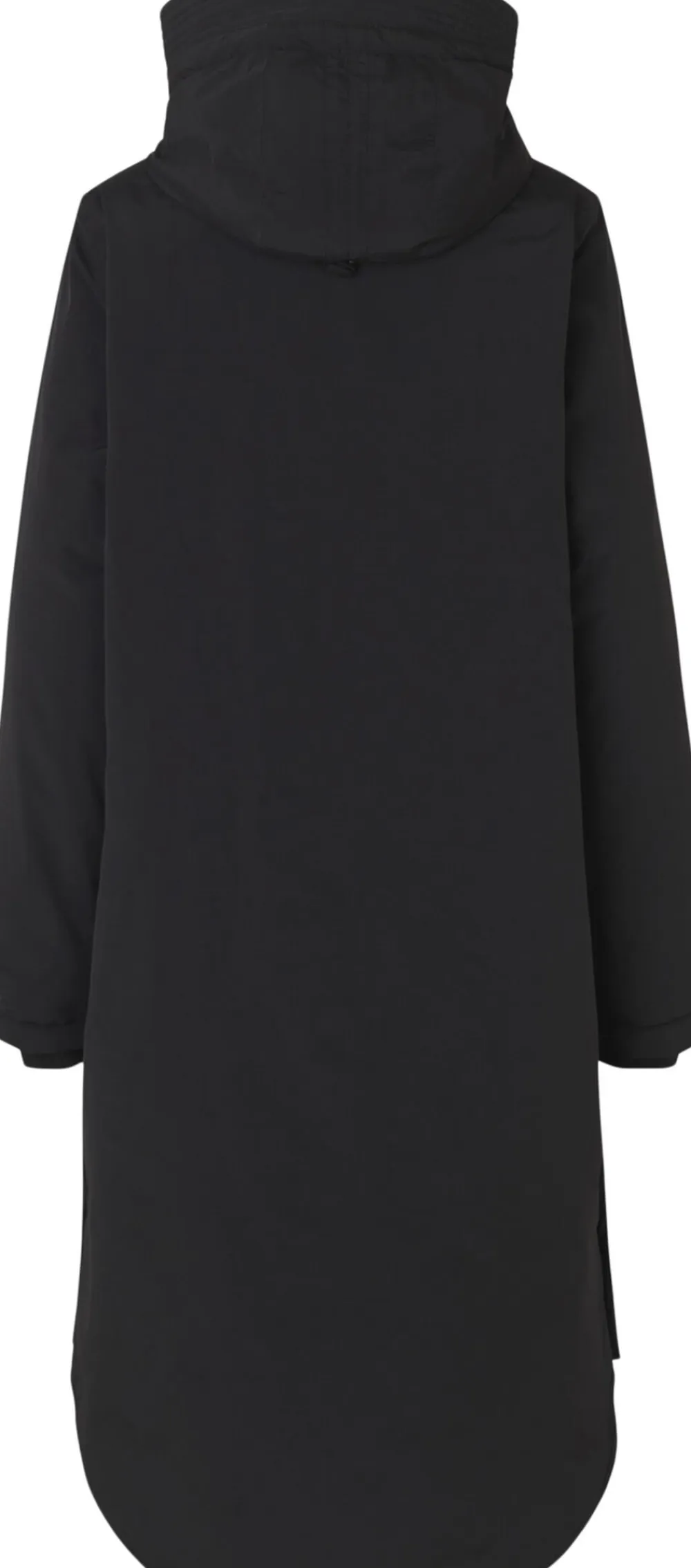 Jakken går til omkring knæene, har en gennemgående lynlås og rumlige lommer.