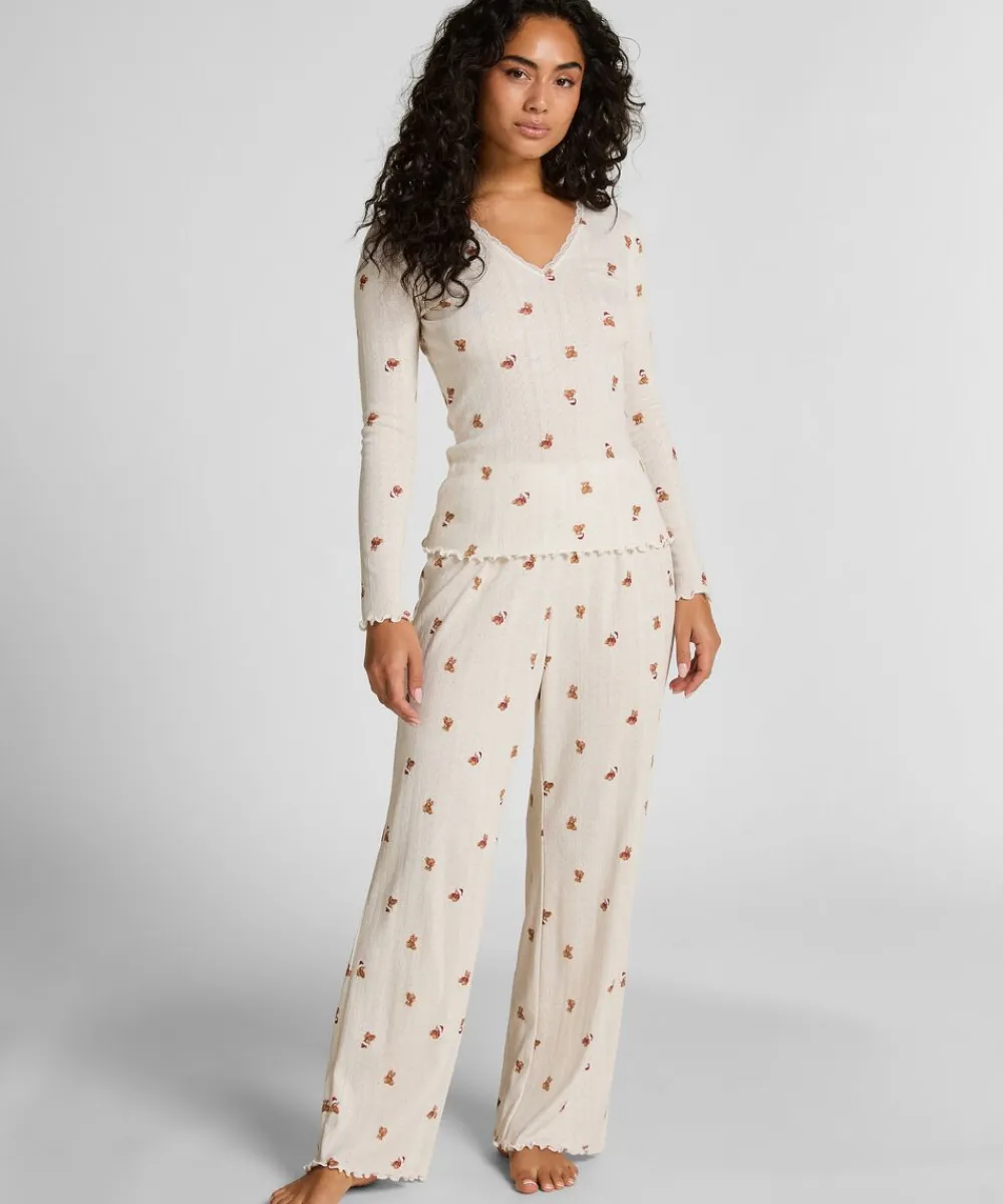 Denne t-shirt er fremstillet af blødt pointellestof med et fint mønster med tekstur for et tidløst look. Blondedetaljer langs halsudskæringen giver et romantisk touch, mens sløjfen i midten tilføjer en legende detalje. Hav det superkomfortabelt i disse dejlige lange pyjamasbukser! Geniale til en hyggelig hjemmeaften. De er fremstillet af det blødeste stof og har et skønt mønster samt søde flæsekanter.