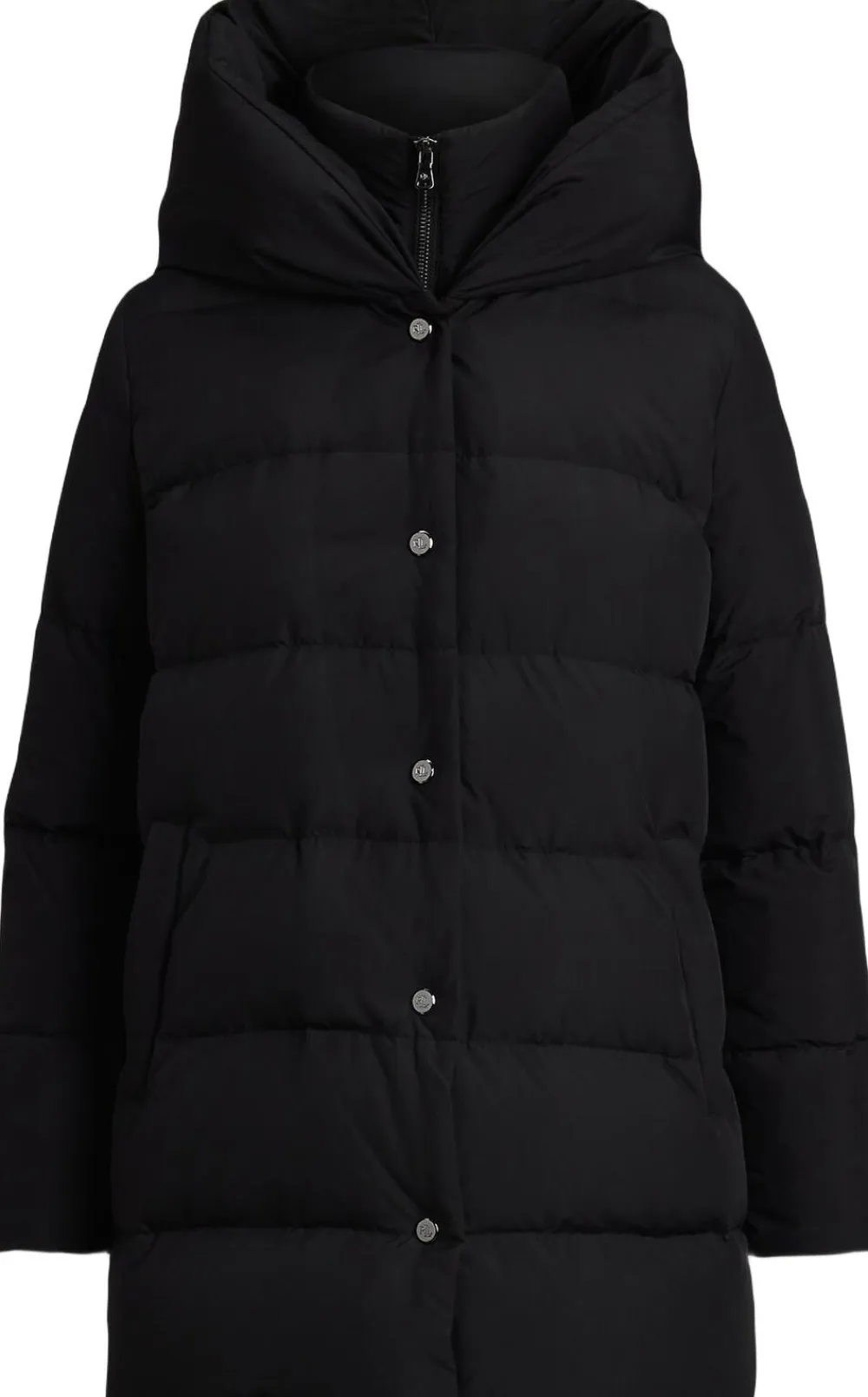 Denne kanalquiltede frakke er dekoreret med signaturindgraverede trykknapper og er udstyret med en overdimensioneret hætte, en indvendig bib og 450-fyld-ned for at sikre, at du holder dig varm