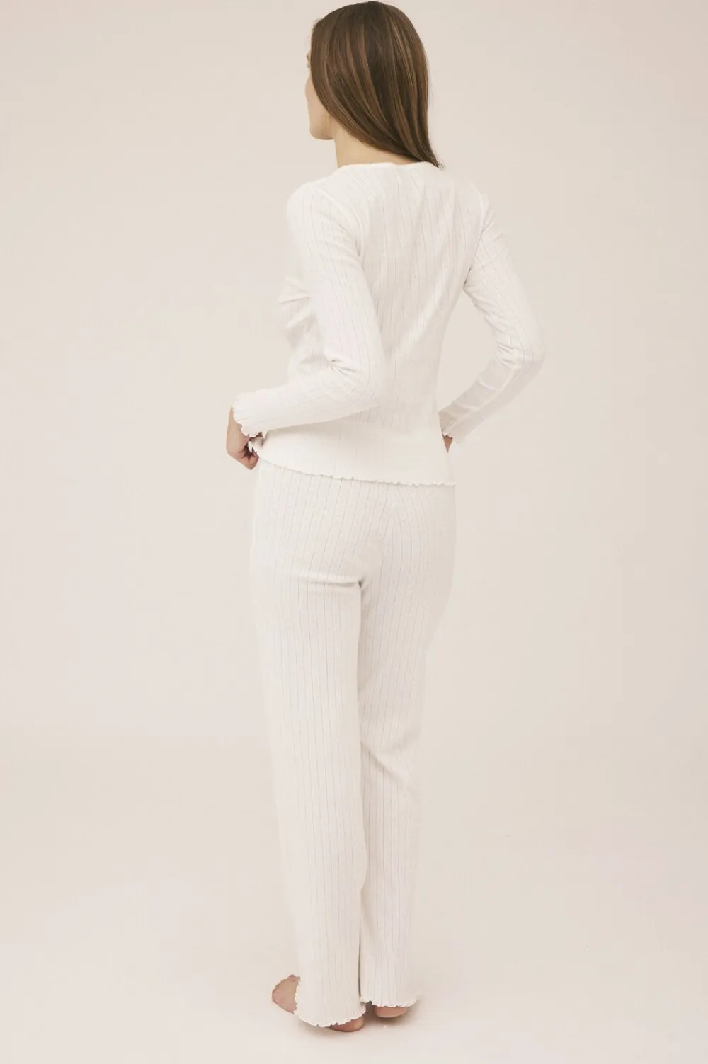 Bukser fra Magasin du Nord Collection i den blødeste kvalitet af 100% økologisk bomuld med GOTS-certificering. Bukserne er enkle i modellen med det fineste hulmønster, sløjfedetalje, bølgekant i bunden samt en smal elastik i taljen. Et par komfortable bukser i den lækreste kvalitet.
