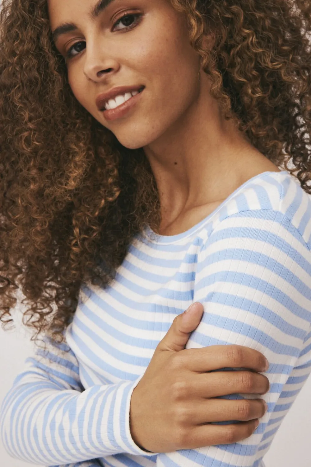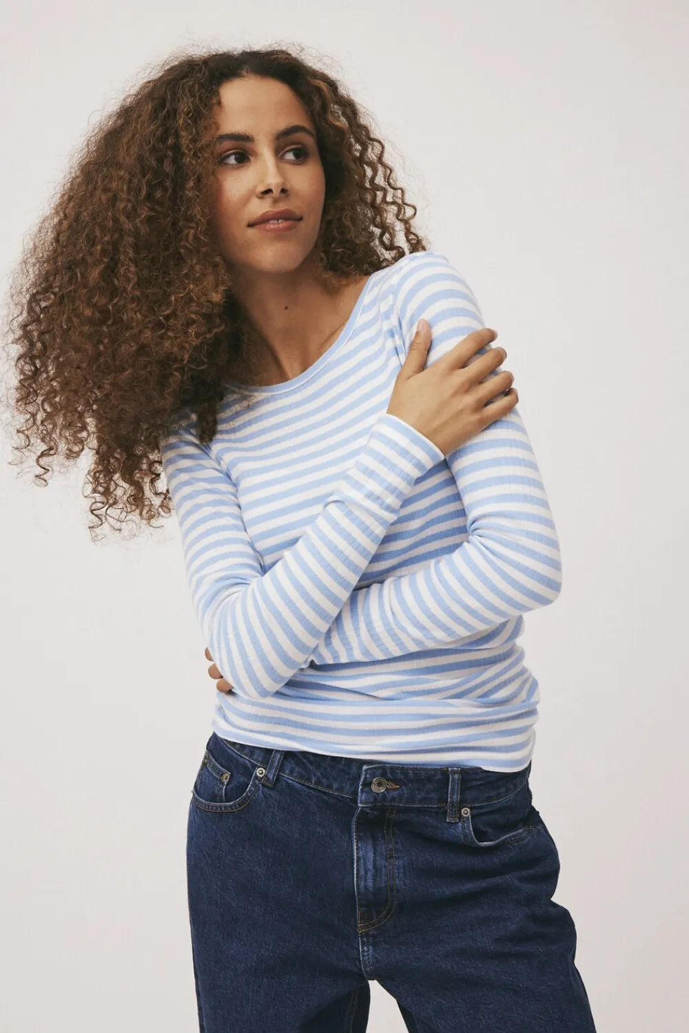 Bluse fra Magasin du Nord Collection i den blødeste kvalitet af 100% økologisk bomuld med GOTS-certificering. Blusen er enkel i modellen med lange ærmer, en smal ribkant langs den runde halsudskæring samt en lækker ribstruktur, der giver blusen en tætsiddende pasform. En skøn bluse i den lækreste kvalitet.