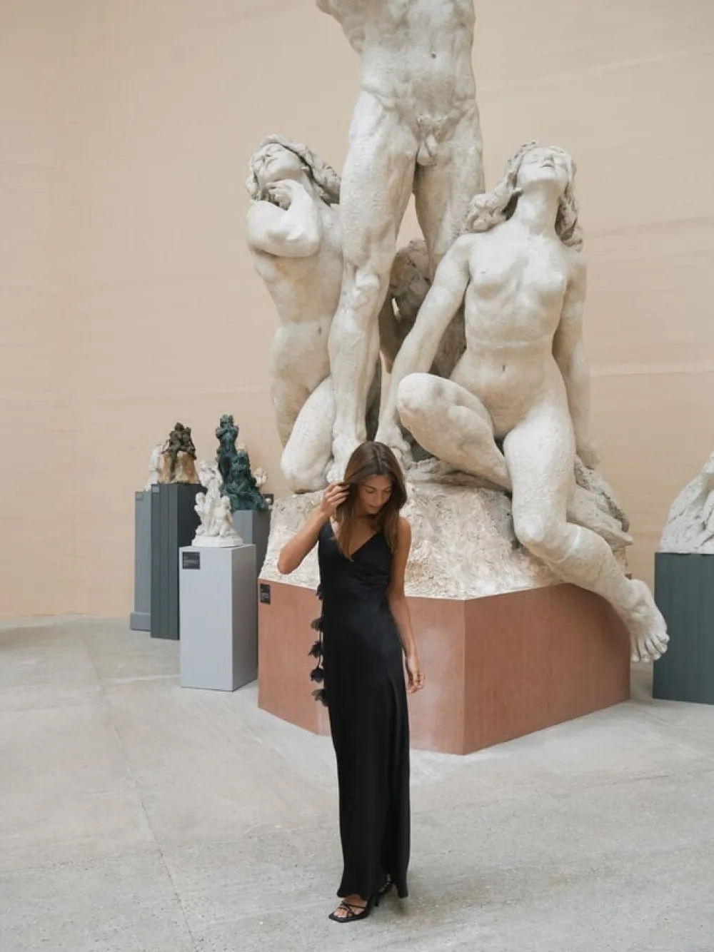 Elegant stropkjole med blomster detaljer på stropperne og bindedetaljer bagtil. Pasformen er flatterende kropsnær, og kommer i en tung crepe satin. Modellen er 176cm og bærer en størrelse 36.