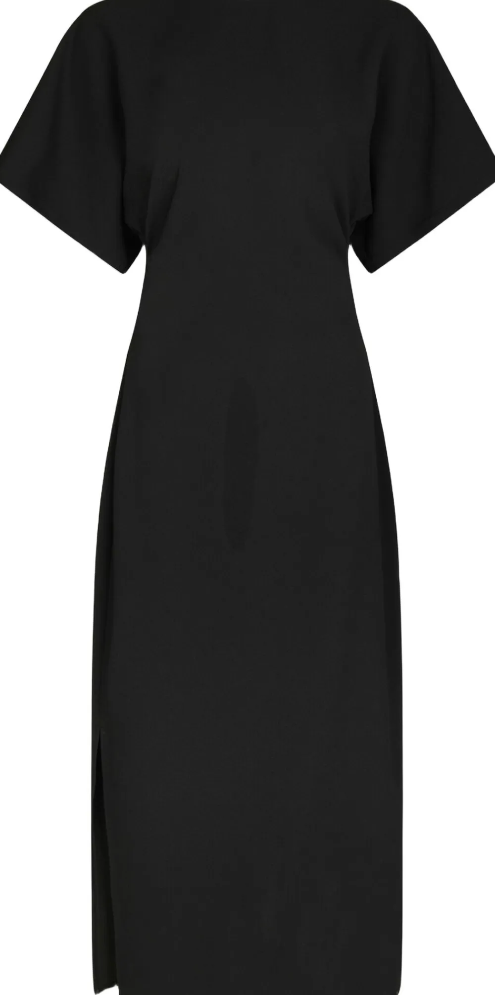Midi kjole med slids i siden. Kjolen har en 36.rund halsudskæring, lukkes med en skjult lynlås i ryggen og har korte, brede ærmer. Den har en almindelig pasform med en tætsiddende talje. Modellen er iført størrelse 36.