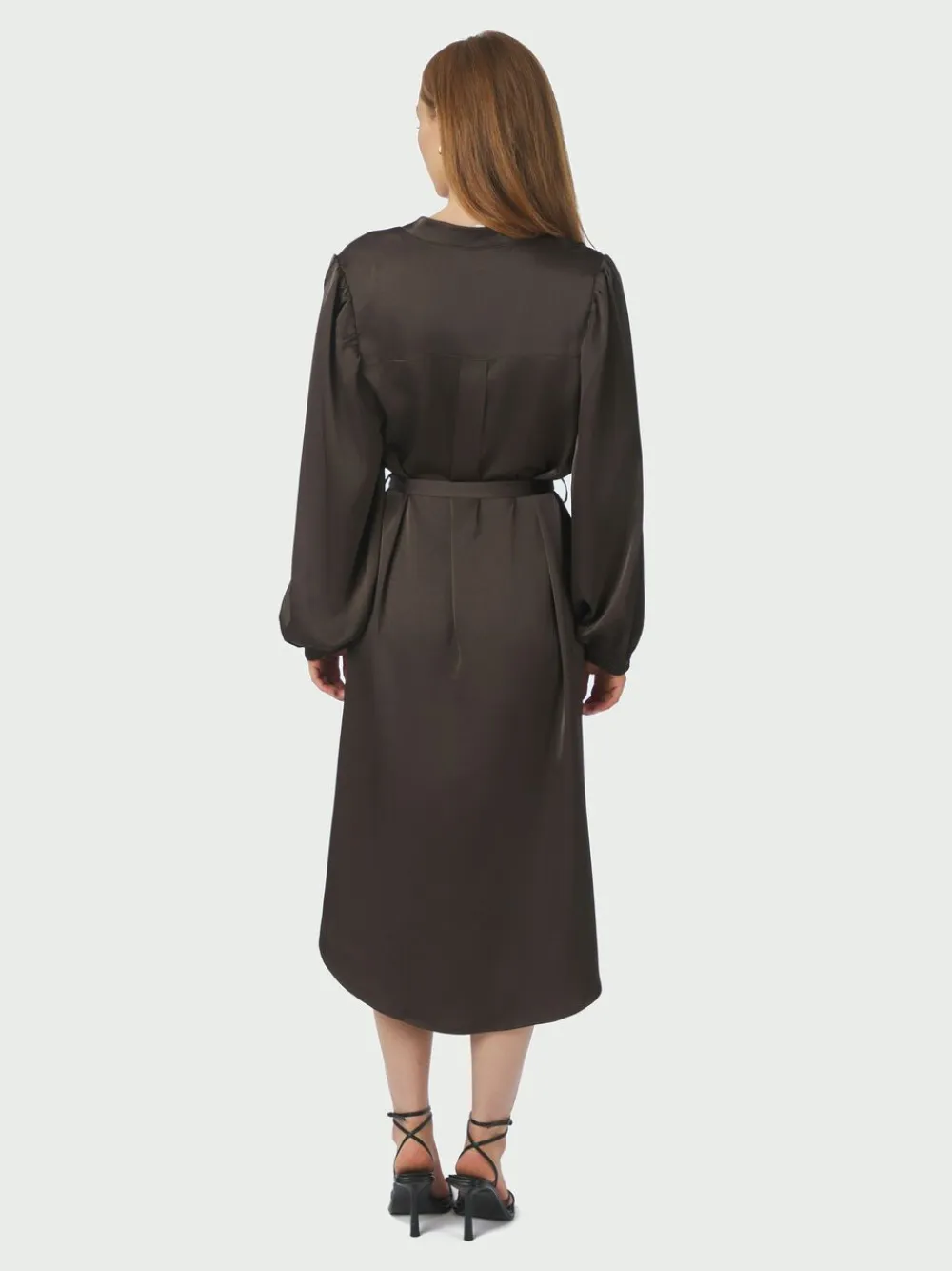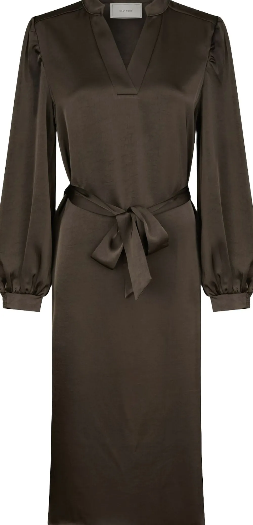 Lang kjole med v-halsudskæring og bælte rundt om taljen, kjolen er i en fin satin kvalitet. Modellen er 176 cm høj og er iført en str. 36.