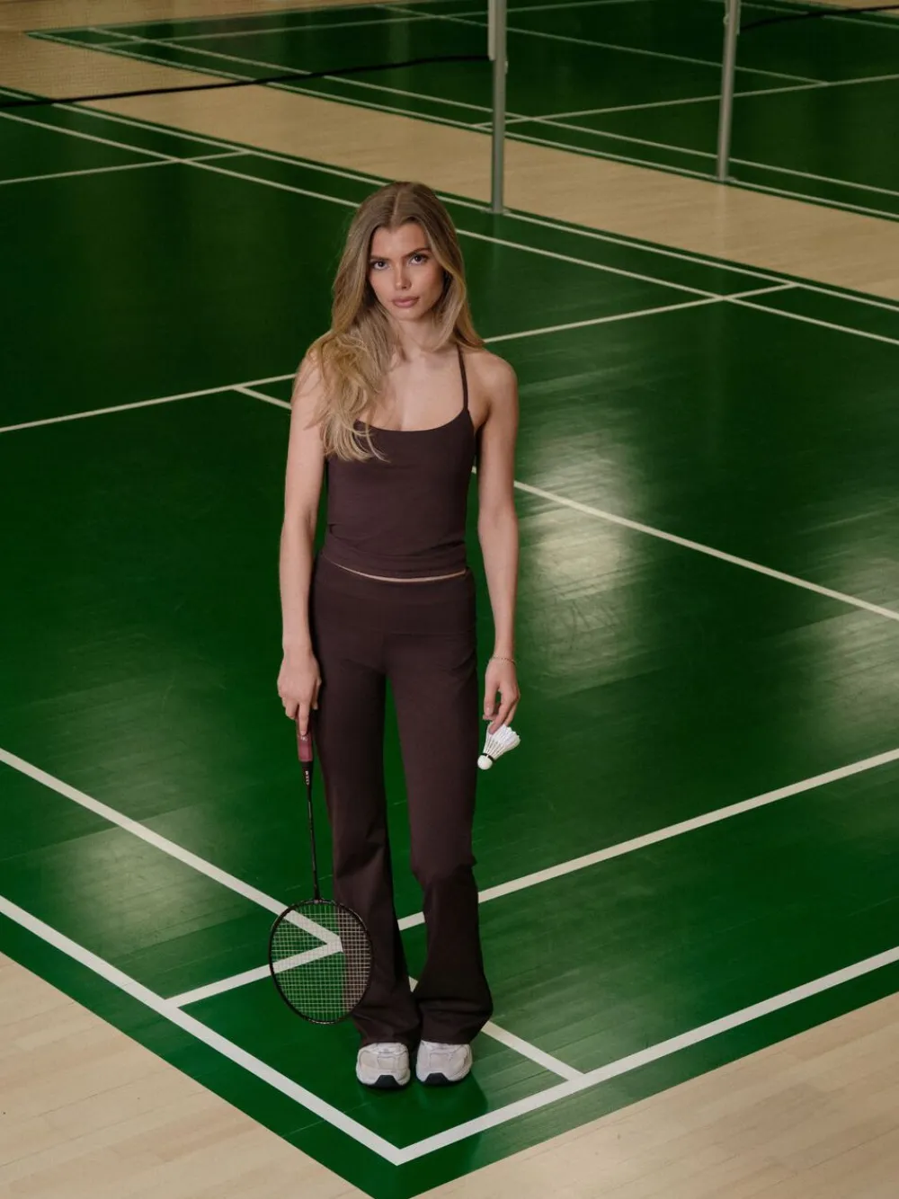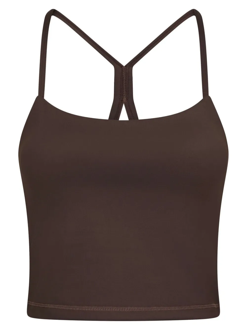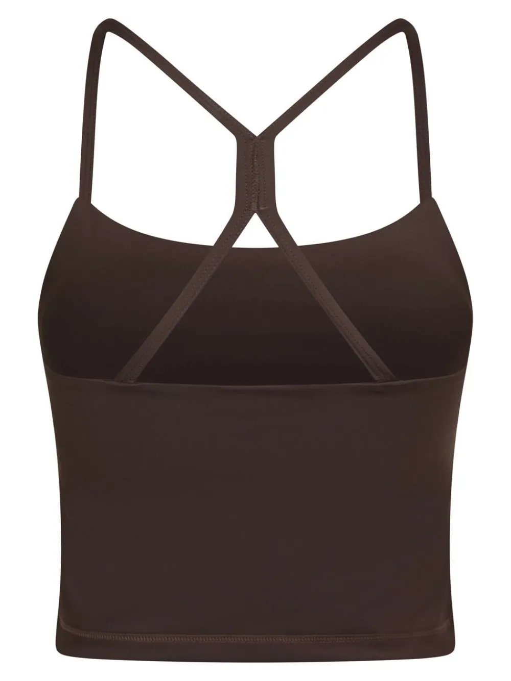 Kort top uden ærmer. Toppen har rund halsudskæring, tynde stropper, der krydser på ryggen, samt forede skåle. Den er lavet i et strækbart materiale og har en tætsiddende pasform. Modellen er iført størrelse 36.