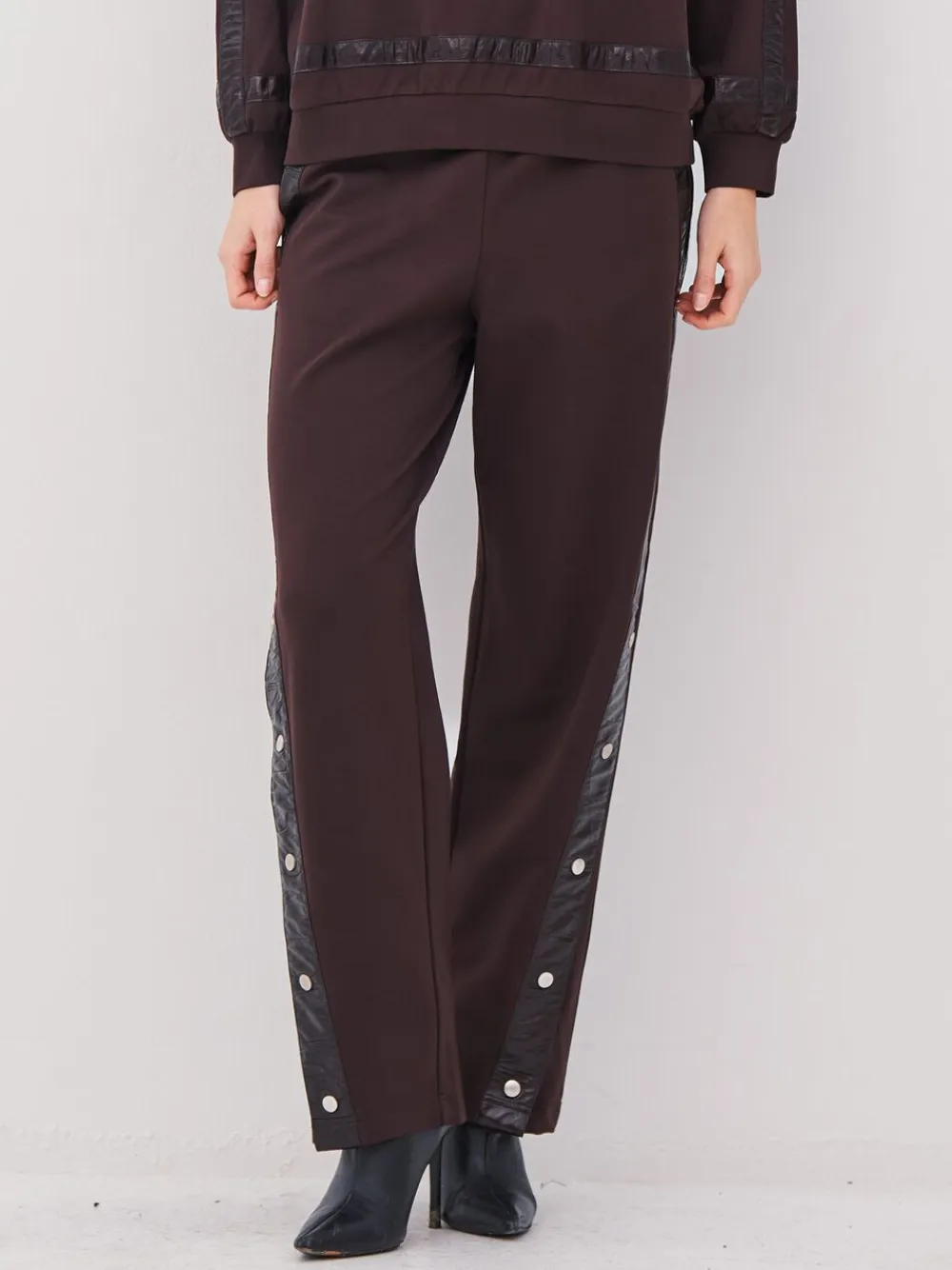Disse bukser kombinerer komfort med sporty detaljer i et moderne Design. De har en lige og afslappet pasform med elastik i taljen og bløde materialer, der gør dem behagelige at have på. Langs siderne er der en kontrasterende læderlookkant med trykknapper, der tilføjer kant og fleksibilitet til stilen. Style bukserne med bluse og sneakers for et afslappet og cool hverdagslook. ((Produktmålinger (Størrelse XS / S / M / L / XL / XXL)- Talje (afslappet)- XS- 66 / S- 70 / M- 74 / L- 80 / XL- 86 / XXL- 92 Hip- XS- 96 / S- 100 / M- 104 / L- 110 / XL- 116 / XXL- 122 Ydersømlængde- XS- 103 / S- 103. 5 / M- 104 / L- 104. 5 / XL- 105 / XXL- 105. 5 Kære kunde Vi har lavet et omhyggeligt målediagram for denne stil, så du kan træffe det rigtige valg første gang. Hvert gennemtænkt køb er en kærlighedserklæring til vores planet – færre afkast betyder mindre CO2 og et renere miljø. Modellen er 180 cm høj og iført størrelse S. )) (((- Læderdetaljer på siderne. – Trykknapper langs benene. – Elastiktalje. )))