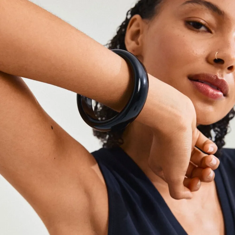 Simplicity is the ultimate sophistication! AASE armbåndet fra Pilgrim er dit nye go-to fashion statement til sommerens outfits. Den sorte armring af genanvendt akryl giver dig en trendy, earthy vibe, og kan let mixes med flere armbånd for en perfekt stacked style. Sommerens must-have til dig, der elsker et simple clean Scandi look, med et enkelt, rent udtryk. Style armbåndet med en oversized blazer og tailored shorts for et chic, minimalistisk look, eller gå all-in med flere farverige accessories for en maksimalistisk tilgang til årets store mix-and-match trend. Lavet af 99% genanvendt materiale, – det er fashion med omtanke.