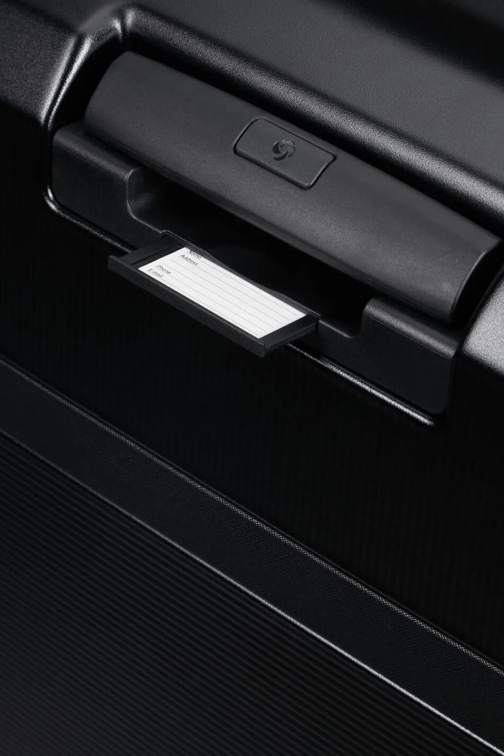 Elegant kuffert med PU detaljer, mulighed for udvidelse, polycarbonat, 4 hjul, TSA lås , indvendig stofforring lavet af genbrugte plastflasker, mulighed for personalisering med de medfølgende stickers, dobbelt trollystativ, navneskilt, vægt 3,8 kg,rumindhold 79/86 l, 5 års garanti,69x45x28/31 cm.