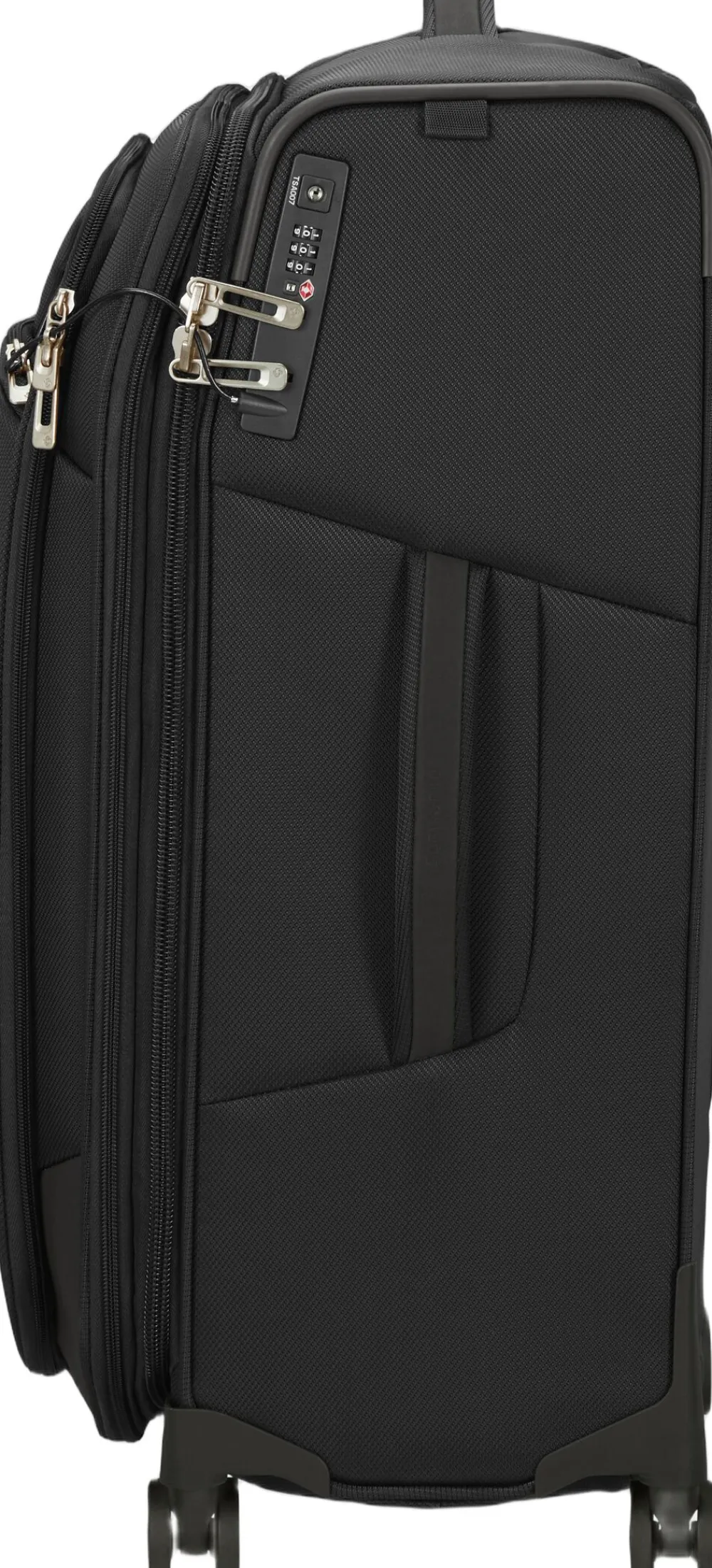 Kuffert hvor både et indvendige og udvendige stor er lavet af genbrugte plastflasker, mulighed for udvidelse, 4 dobbelte hjul, TSA lås , dobbelt trollystativ, navneskilt, låsbar frontlomme, vægt 3,2 kg,rumindhold 82/92 l, 5 års garanti, 67x43x29/33 cm.