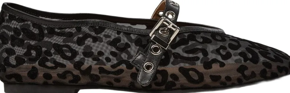 • Elegant ballerina i mesh og læder • Gennemsigtig med sort leopard i fløjl • Rund tå • Justerbar rem med nittedetaljer
