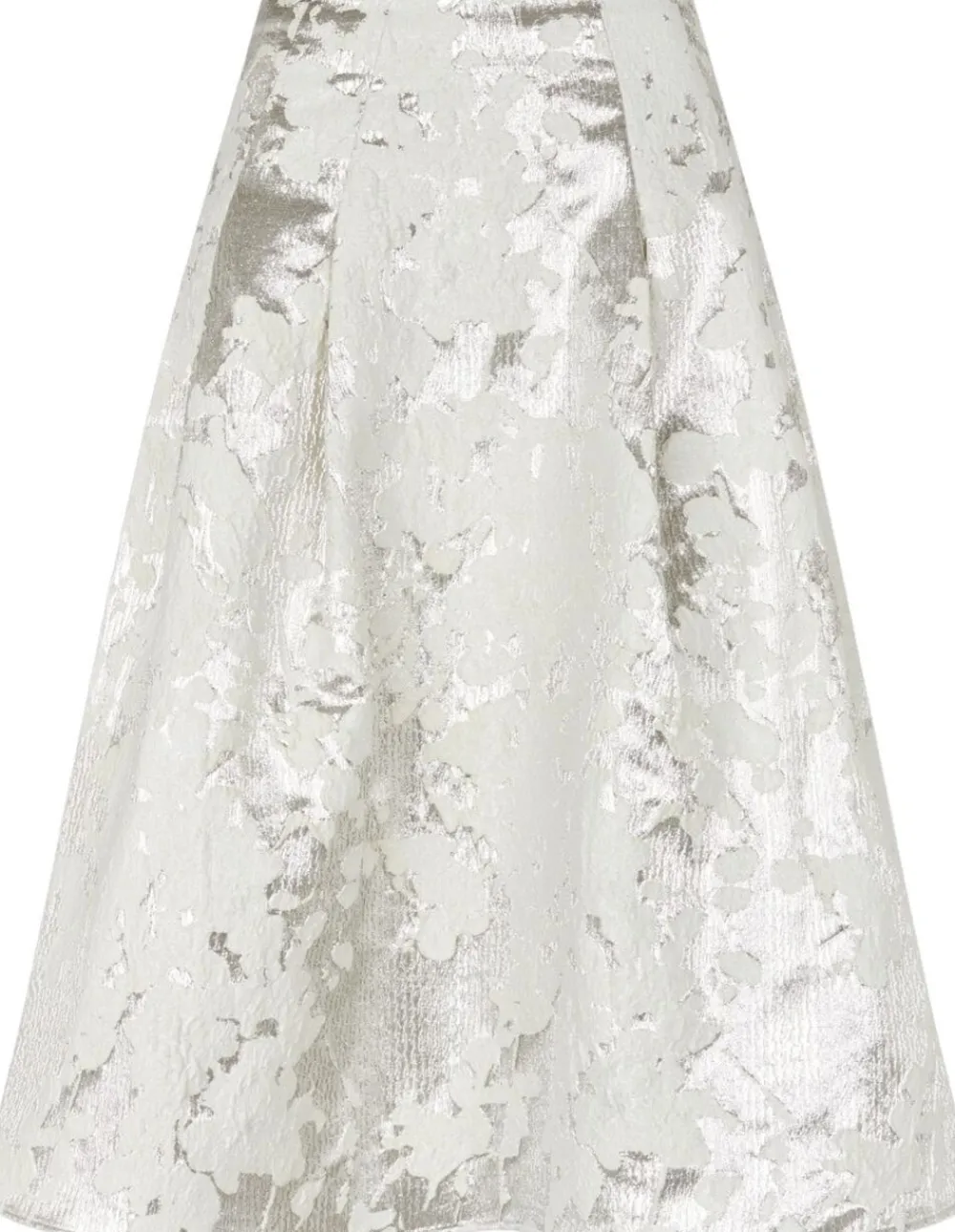 Nederdel til under knæet med voluminøs silhuet, høj talje og sidelommer. Har et blomstermønster med tekstur og metaldetaljer