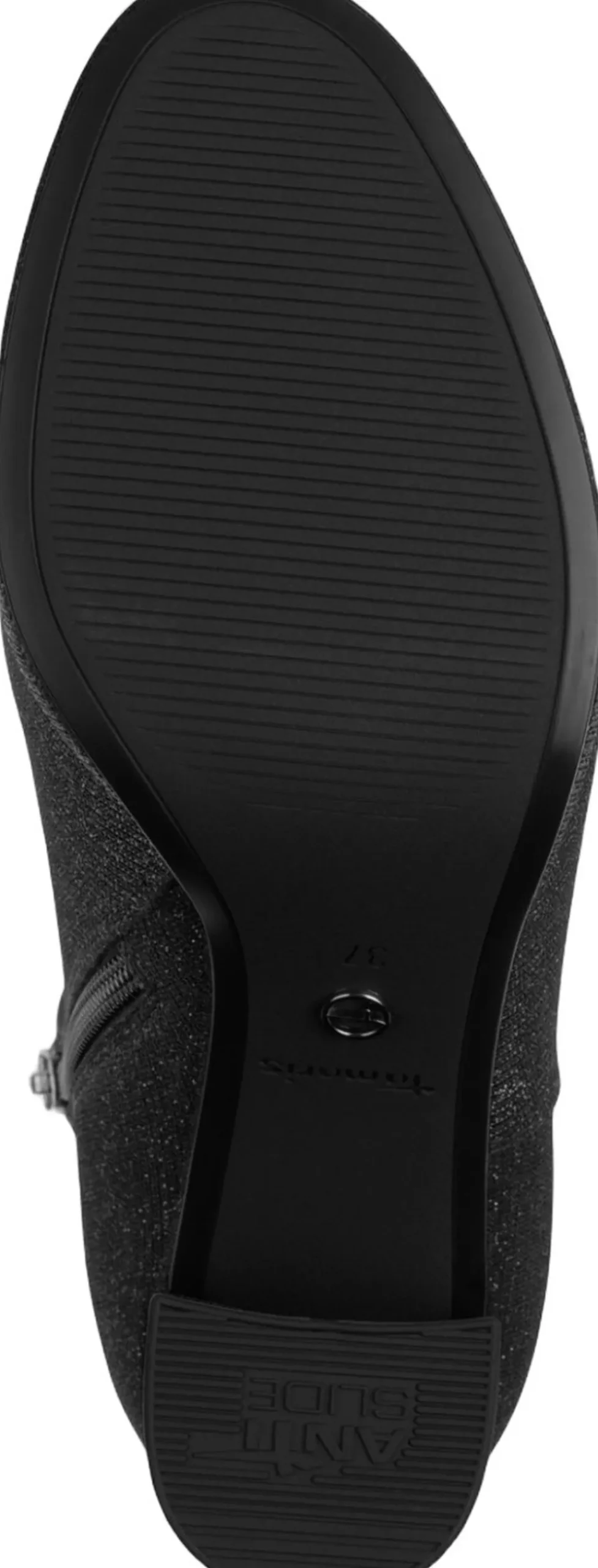 Kort let støvle i sort glitter tekstil materiale. Blokhæl på 80mm skafthøjde på 10 cm. Indvendig lynlås og der er antislide og antichok i hælen samt Touch it effekt i dæksålen