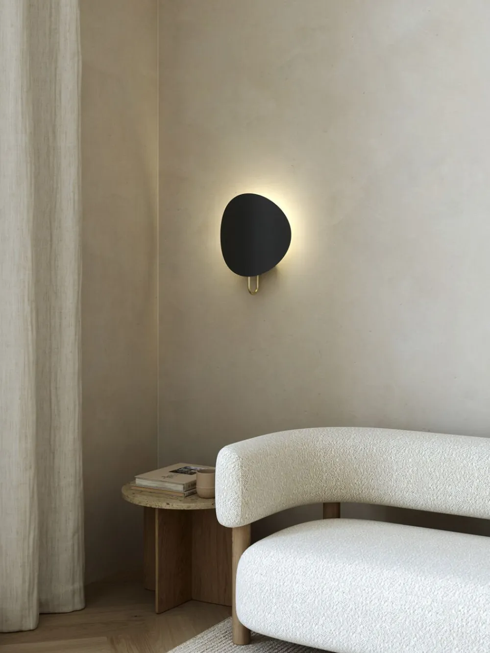 Indirekte lys er drivkraften bag Spargo-væglampen af danske Anker Studio. Den store, let buede skærm reflekterer lyset op på væggen og spreder det ud i rummet. Skærmen sidder elegant fast på basen i børstet messing.