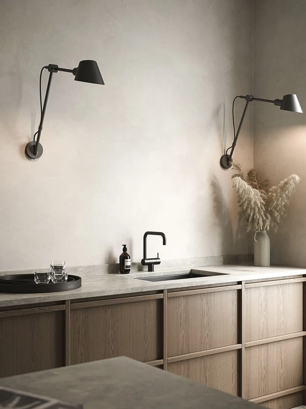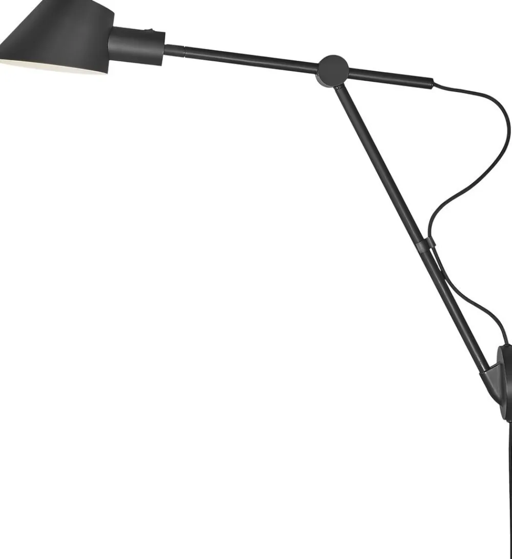 Stay i sort silkemat metal er et spændende alternativ til den klassiske væglampe, der med sit funktionelle design resulterer i smuk belysning. Lampen har høj funktionsværdi, idet lampens arm og hoved kan justeres efter behov, hvilket gør Stay perfekt som arbejdsbelysning i køkkenet eller ved siden af sengen.
