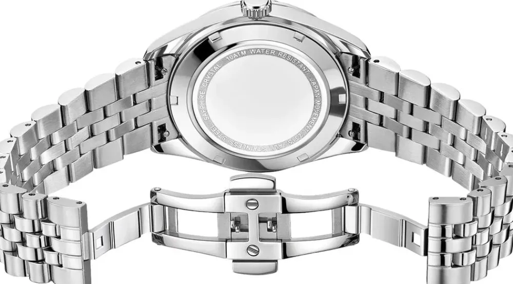Dette ur er stylet i sølvtoner for urkassen, bezelen og lænken, hvilket fremhæver dets sammenhængende udseende. Foldelåsen sikrer en sikker pasform, mens Super-LumiNova lumen muliggør nem læsbarhed i svagt lys. Med en vandtæthed på 10 ATM er det velegnet til svømning, hvilket tilføjer alsidighed til dets anvendelse. Urkassen er lavet af 316L kirurgisk stål, og safirglasset tilbyder ridsemodstand, hvilket bevarer urets polerede udseende.