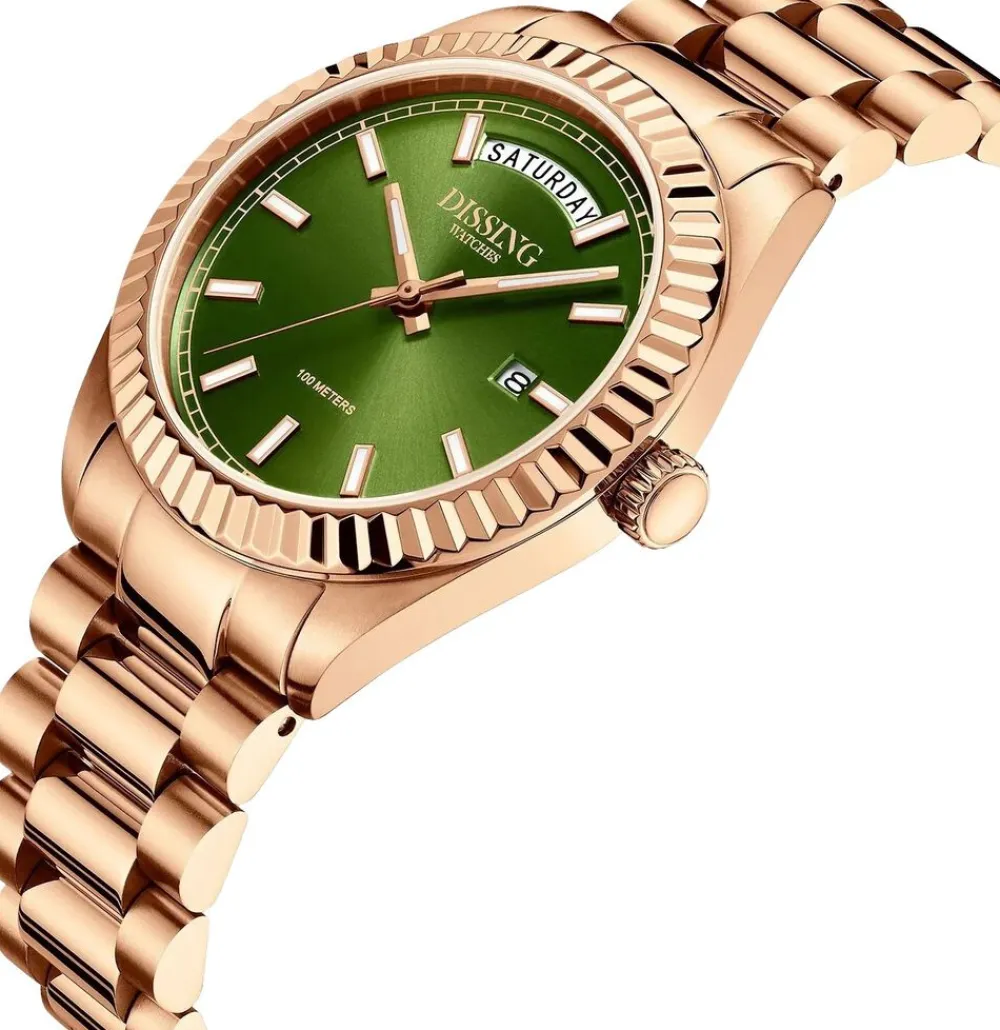 Dissing Day Date D1745 er en del af Dissing Date-kollektionen og har en rund urkasse med en flutet bezel, der tilføjer et strejf af elegance. Dens 39 mm diameter gør et subtilt, men markant indtryk på håndleddet. Den grønne urskive giver en klar baggrund for timemarkeringerne og viserne. Dette ur inkluderer en dags- og datovisning, hver placeret i separate vinduer på urskiven. Lænken i rustfrit stål, i rosaguld, komplementerer rosaguldtonerne i urkassen og bezelen, hvilket skaber et sammenhængende look. En glidelås sikrer uret og kombinerer stil med funktionalitet.