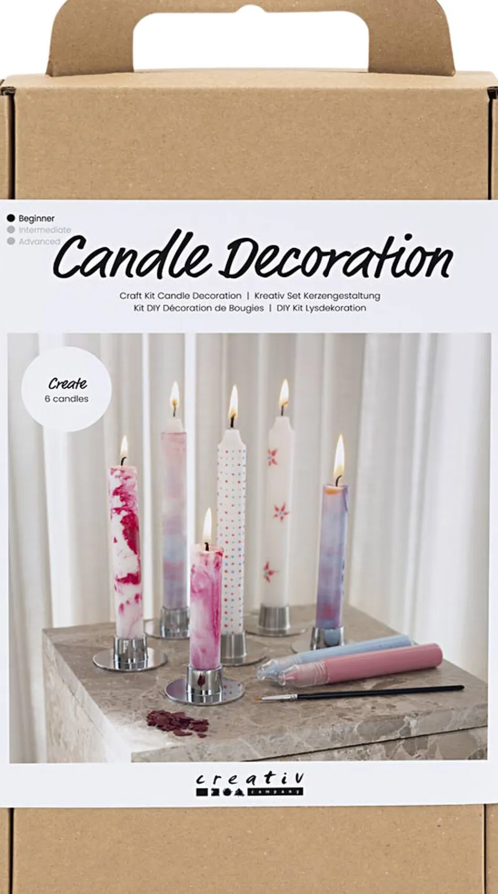 Med dette kit kan du lave farverige lys med tre forskellige dekorationsteknikker. Indeholder materialer nok til seks lys, og al den vejledning du behøver. Synes du også, at hvide lys er for kedelige? Så prøv vores Mini DIY Kit til lysdekoration. Her lærer du at dekorere de smukkeste stearinlys gennem tre forskellige teknikker. Tegn motiver direkte på lysene med lyspenne rul lysene i farvedækket bagepapir eller dyp lysene i smeltede farver, så der opstår flot marmorering. Hver teknik giver lysene personlighed, og hvert lys bliver nærmest et kunstværk i sig selv.
