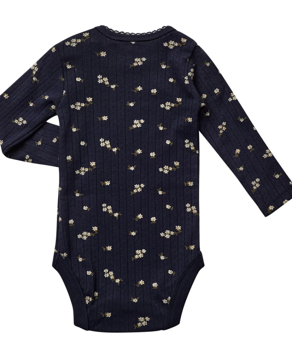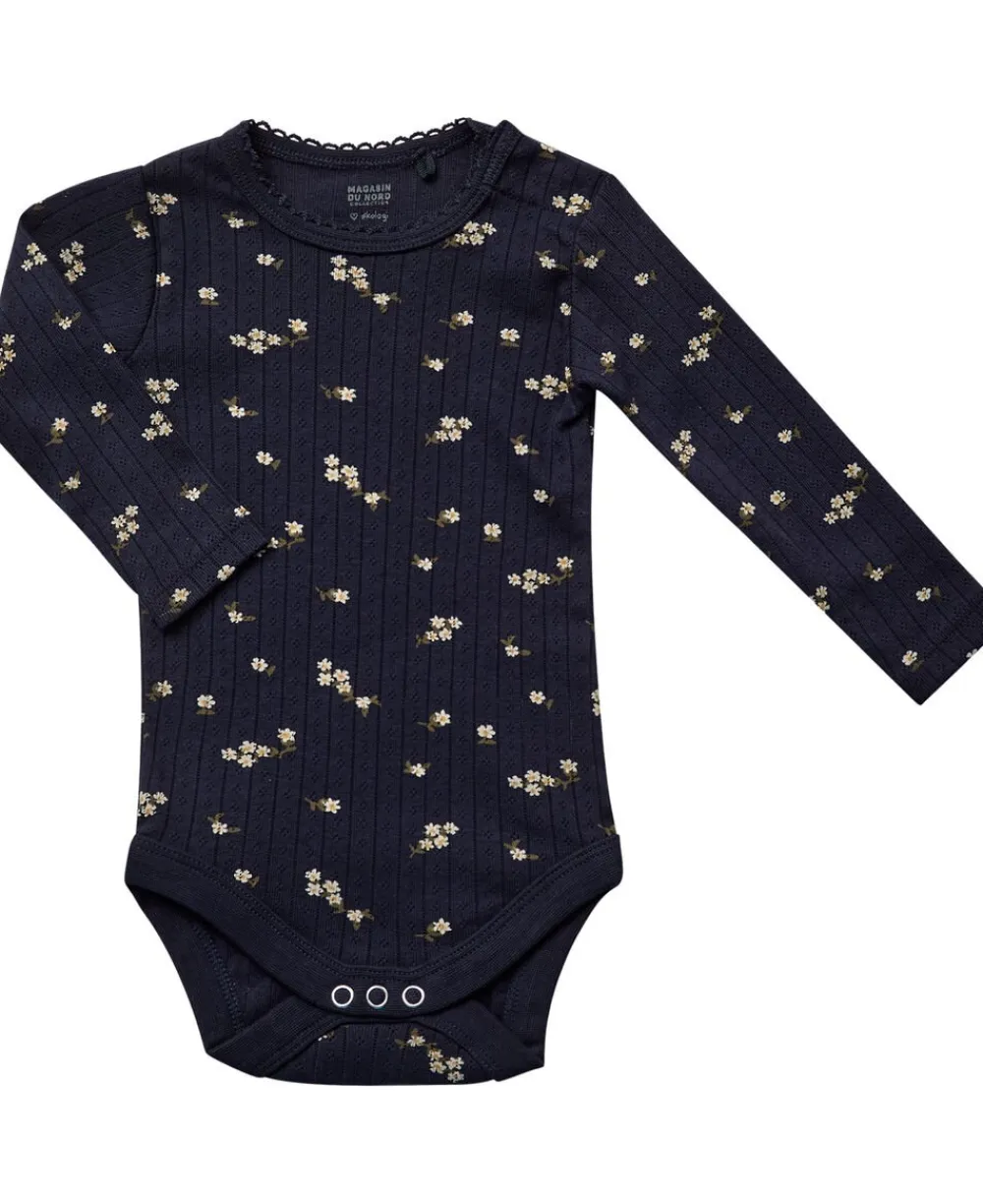 Body fra Magasin du Nord Collection i den blødeste kvalitet af 100% økologisk bomuld med GOTS-certificering. Bodyen har det fineste pointellemønster, der giver materialet et let, luftigt og dekorativt udtryk. Derudover har bodyen et blomstret print, lange ærmer, blondekant i den runde halsudskæring samt trykknapper i kilen og ved den ene skulder. En skøn body i en lækker kvalitet.