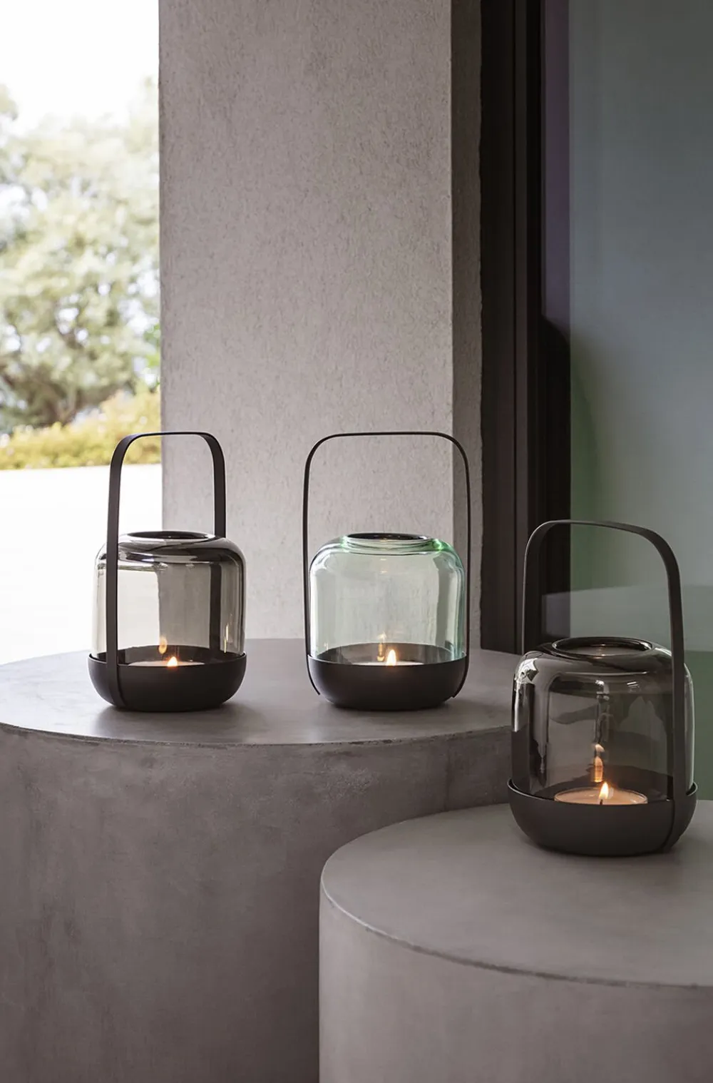 Lad hyggen sprede sig både inde og ude med den elegante og dekorative Acorn lanterne. Med sit praktiske greb i pulverlakeret stål er lanternen lige til at tage med sig, f.eks. ud på terrassen. Glassets smukt afstemte Stone-nuance er inspireret af den rå natur omkring os. Lanternen tændes nemt ved blot at løfte glasset og passer til fyrfadslys i standardstørrelse.