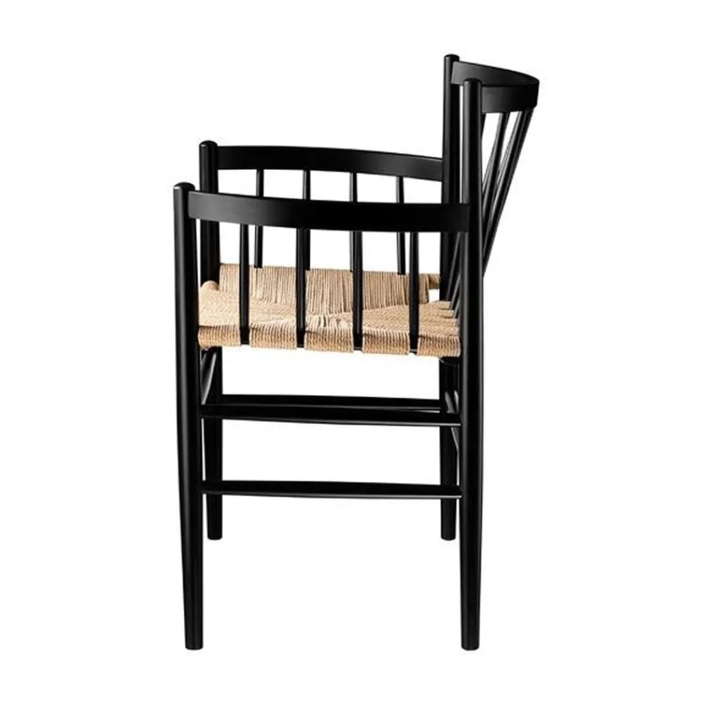 Det er de små detaljer, der har gjort en af de mest komfortable spisestuestole endnu mere komfortabel. Da Jørgen Bækmark tilføjede et armlæn til J81, storebror til J80, blev resultatet både en mere komfortabel stol, men også med en naturlig videreførelse af den buede form i stoleryggen. Desuden er stolen en anelse bredere end J80, hvilket selvfølgelig også giver lidt mere komfort. Designet stammer tilbage fra FDB Møblers guldalder, men proportionerne er justeret lidt, da danskerne i gennemsnit er fem-seks centimeter højere i dag, end de var i 1950’erne. Men ellers fremstår designet som dengang – og samtidig helt nutidig og aktuel. Stolens fletsæde giver ekstra siddekomfort og stolen egner sig derfor godt som spisebordsstol, men også som fritstående møbel i entré. J81 Jørgen Bækmark Spisebordsstol med armlæn Designer: Jørgen Bækmark Type: Spisebordsstol Model: J81 Materiale: Bøg Flet: Natur Farve: Sort/natur Behandling: Lakeret Leveres samlet: Ja Kan stables: Nej Vedligeholdelse og pleje: Aftørres med opvredet klud Ryghøjde: 82 cm Siddehøjde: 44,5 cm Sædedybde: 39,5 cm Armlænshøjde: 68 cm Ydermål på ben: 55 cm Mål: Højde x Bredde x Dybde: 82,0 x 65,3 x 53,3