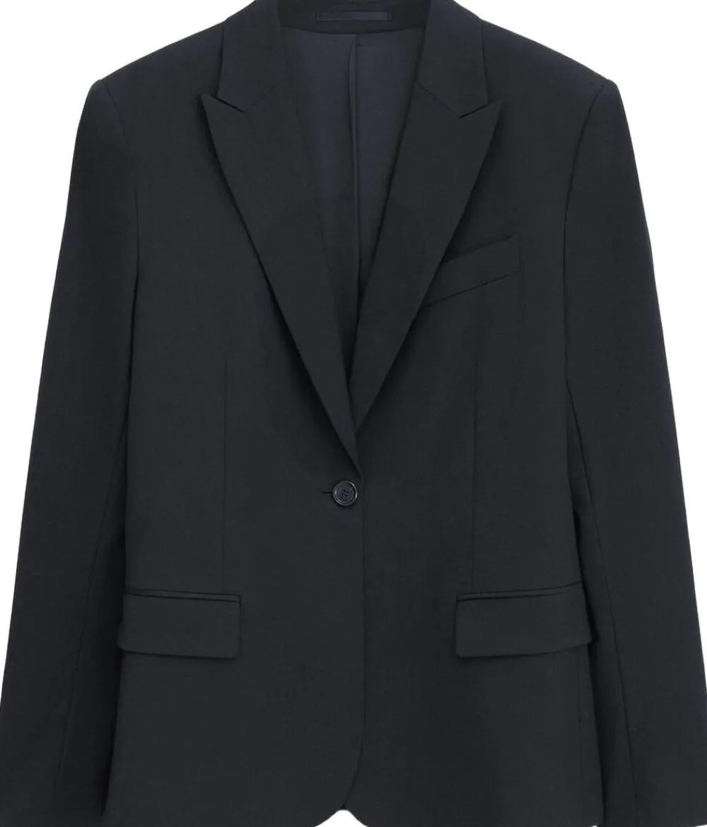 Single blazer i uldblanding med stræk. Single ryg ve nt, peaklapel, knappet ærmeåbning, vinklet brystlomme og to klaplommer. Fuldt foret.