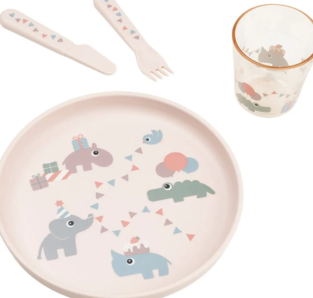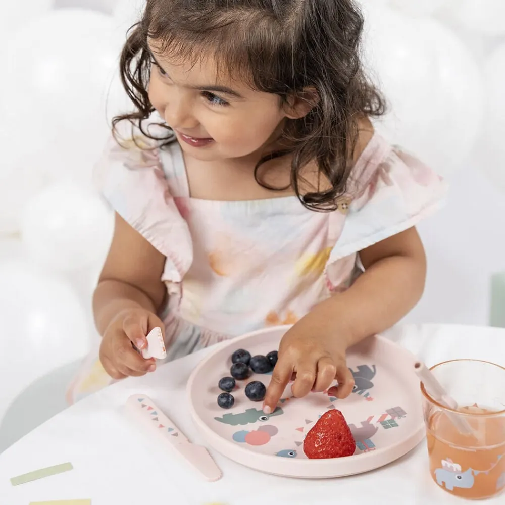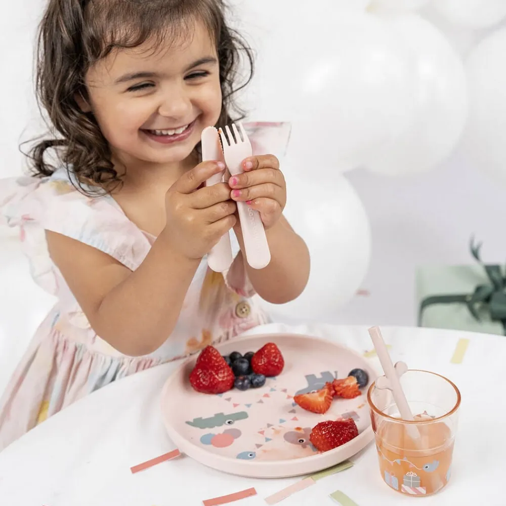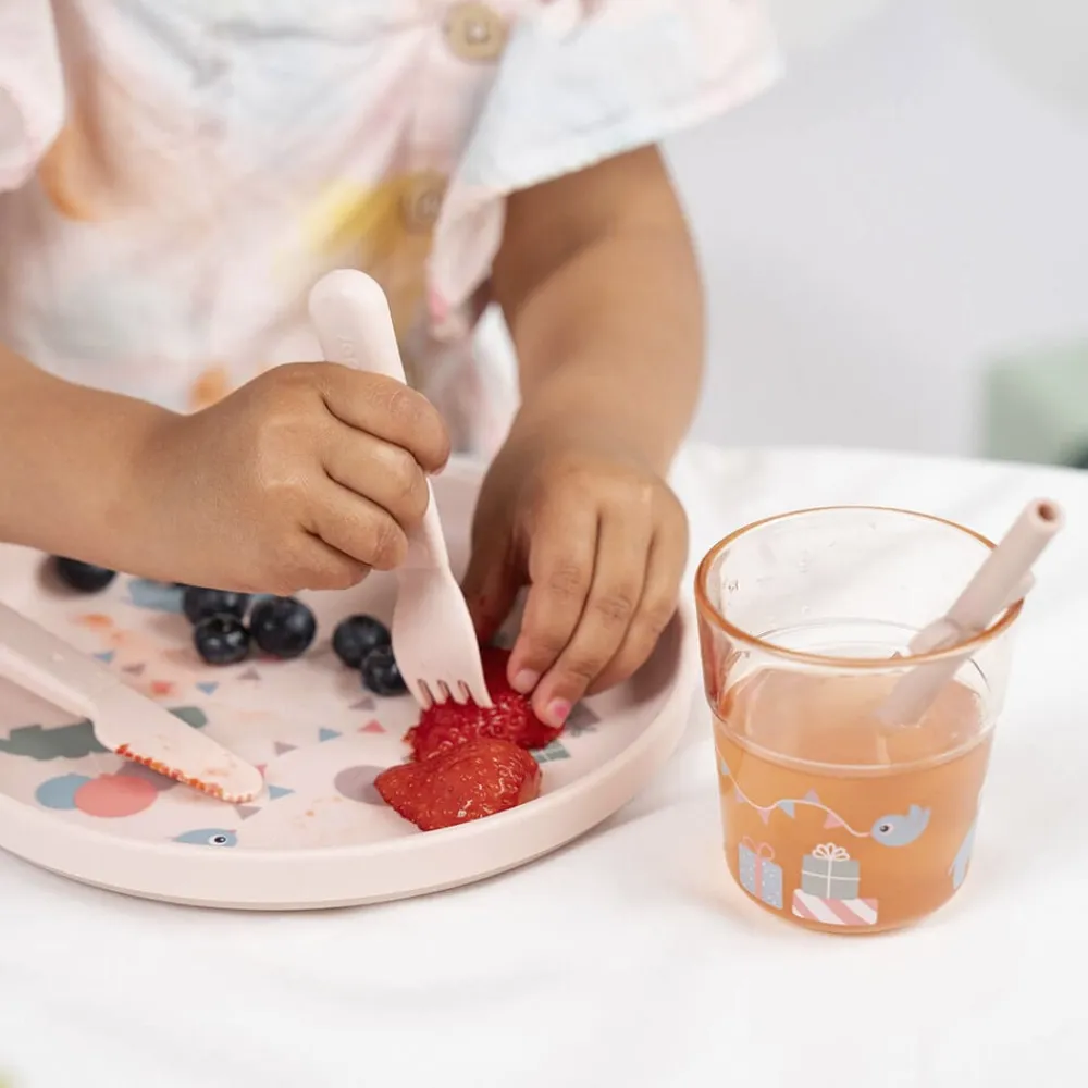 - Materiale:Tallerken: 100% fødevarekvalitet PP med antislip TPE. Bestik: 100% fød