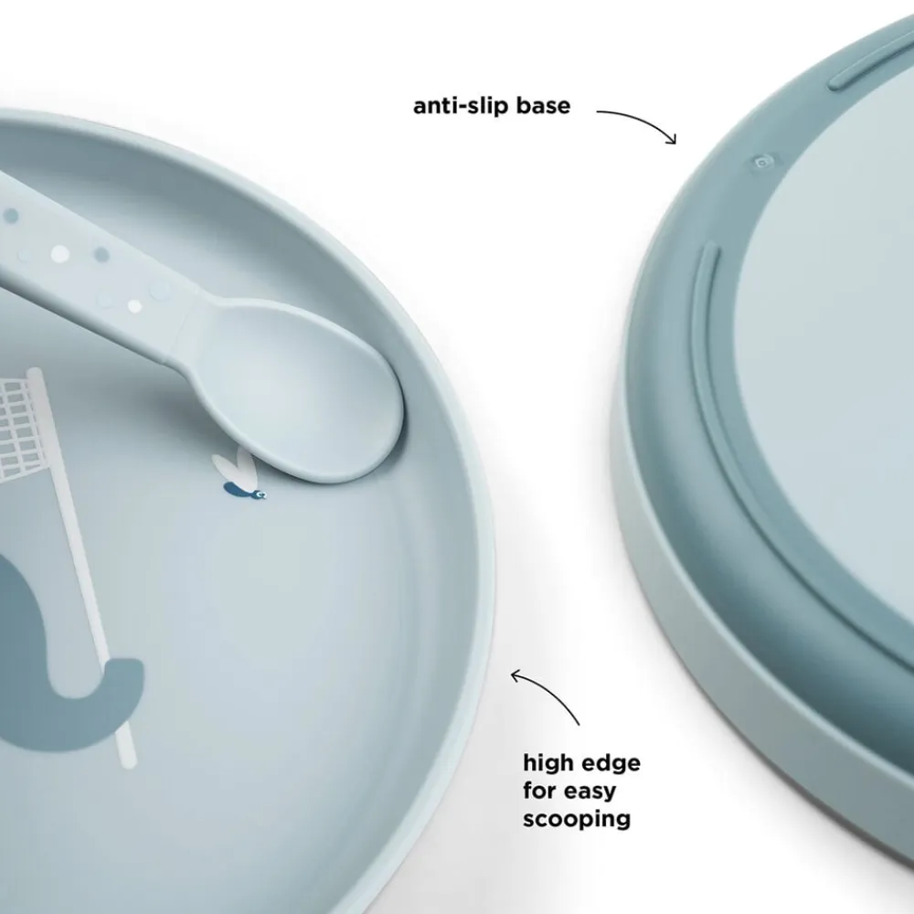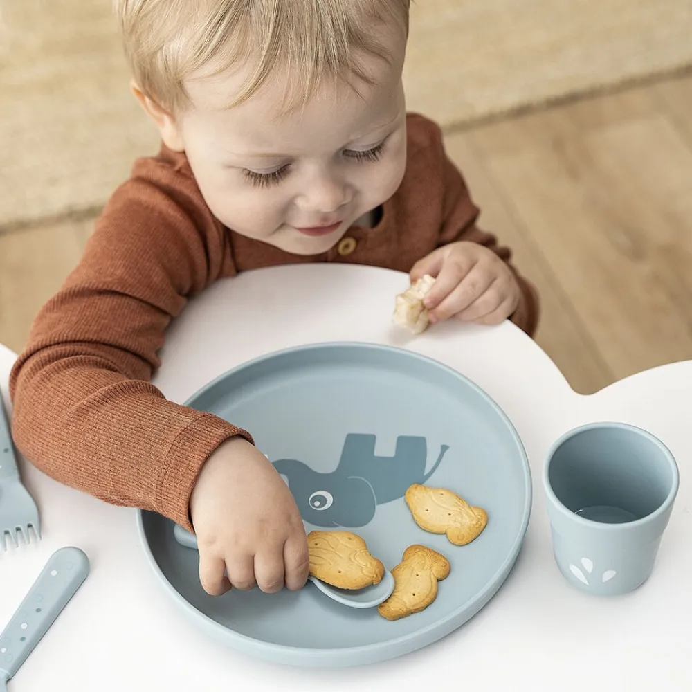 Servér dit barns mad på den søde og praktiske Foodie tallerken og lad det legende print bringe glæde til måltidet. Den høje kant hjælper barnet med at fange maden, mens den praktiske, skridsikre bund sørger for, at tallerkenen bliver, hvor den skal. Tallerkenen er designet til hverdagslivet med børn og tåler både opvaskemaskine og mikroovn. Efter utallige familiemiddage og børnefester kan tallerkenen affaldssorteres som plast og genanvendes til produktion af nye hverdagsprodukter. Den blå tallerken er dekoreret med et legende motiv af den muntre elefant Elphee, der fanger ildfluer i sit net. Bundens mørkeblå farve tilføjer en fin, tofarvet detalje.