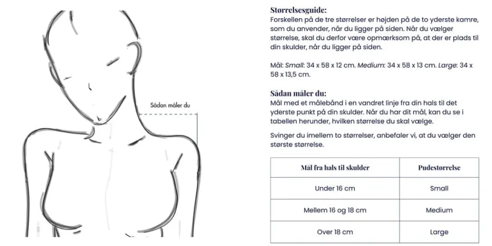 Se størrelsesguide for at finde den pude der passer bedst til dig. Hovedpudebetræk i 100% bomuldssatin medfølger.