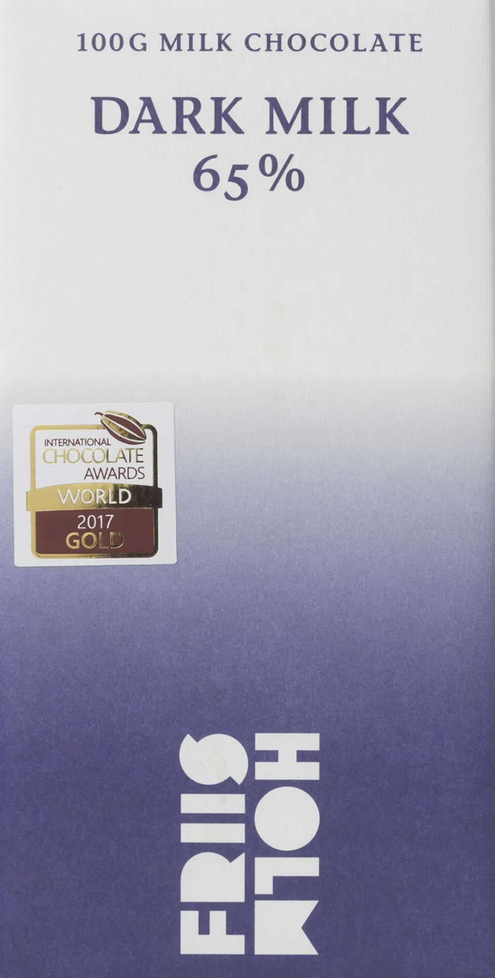 Milk 55 %, men med meget lidt mælkepulver, med andre ord er det en mørk chokolade, der er afrundet med en smule mælk. Den ligger lige mellem en mælke- og en mørk chokolade, og for nogle mennesker er det den chokolade, de har ledt efter hele deres liv.