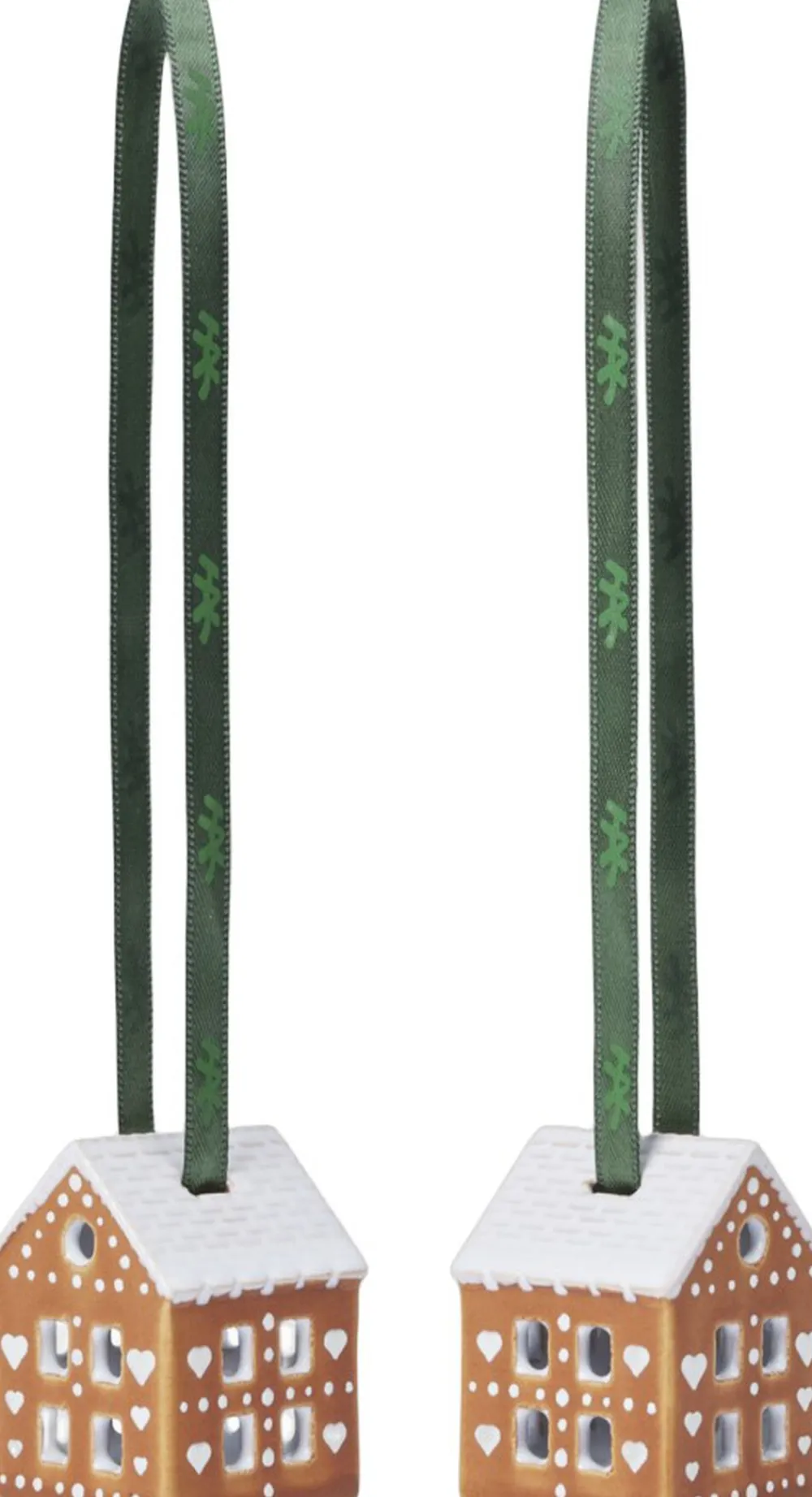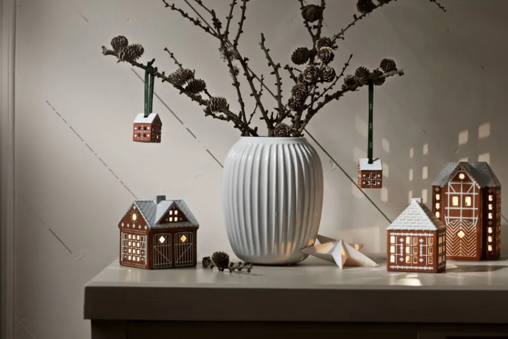 En smagfuld juleklassiker i håndlavet keramik formet af tradition. Kähler Gingerbread er en serie af moderne honningkagehuse og ophæng fra Kähler, hvor kombinationen af et charmerende udtryk og håndlavede designtraditioner møder varmen fra fyrfadslysene og de klassiske juletraditioner, der skaber både stil og hygge. Bagværk hører julen til, og med sit naturtro udtryk er det det let at forestille sig, at Kähler netop har taget et nybagt honningkagehus ud af keramikovnen. Ja, du kan næsten dufte honningkagen, men tag ikke fejl hele Gingerbread-serien er skabt i stentøj, og den hvide glasur er keramisk. De små Kähler Gingerbread-juleophæng måler 5 cm i højden og er dekoreret med sirlige mønstre med de sødeste små hjerter og sne på taget, som man ville dekorere et honningkagehus. Lad dem pynte på grene, i vinduet eller på juletræet og nyd dem gennem hele december sammen med resten af serien. I toppen af Gingerbread-juleophængene er der to små huller i taget, hvori der er montereret elegante bånd i Kählers velkendte grønne farve. De påtrykte HAK-initialer skaber en taktil og levende ophængning, der omfavner Kähler-historien og står i smuk kontrast til det varme og brune farve på stentøjet. Gingerbread-juleophængene sælges parvis og skal selvfølgelig gemmes i generationer og tages frem år efter år som en smuk og hyggelig tilføjelse til julepynten i familien. Mette Bache og Barbara Bendix Becker er designerne bag Kähler Gingerbread, og deres formgivning er kendetegnet ved mødet mellem det stringente og det autentiske. Lyshusenes geometriske flader blødes op af de sirlige dekorationer og de mange vinduer og døre, der alle stor som lille er udskåret i hånden, så lyshusene får et naturligt og hyggeligt udtryk. Og på samme måde er juleophængene enkle og grafiske, men fulde af liv og autenticitet i kraft af dekorationerne og det håndlavede udtryk.