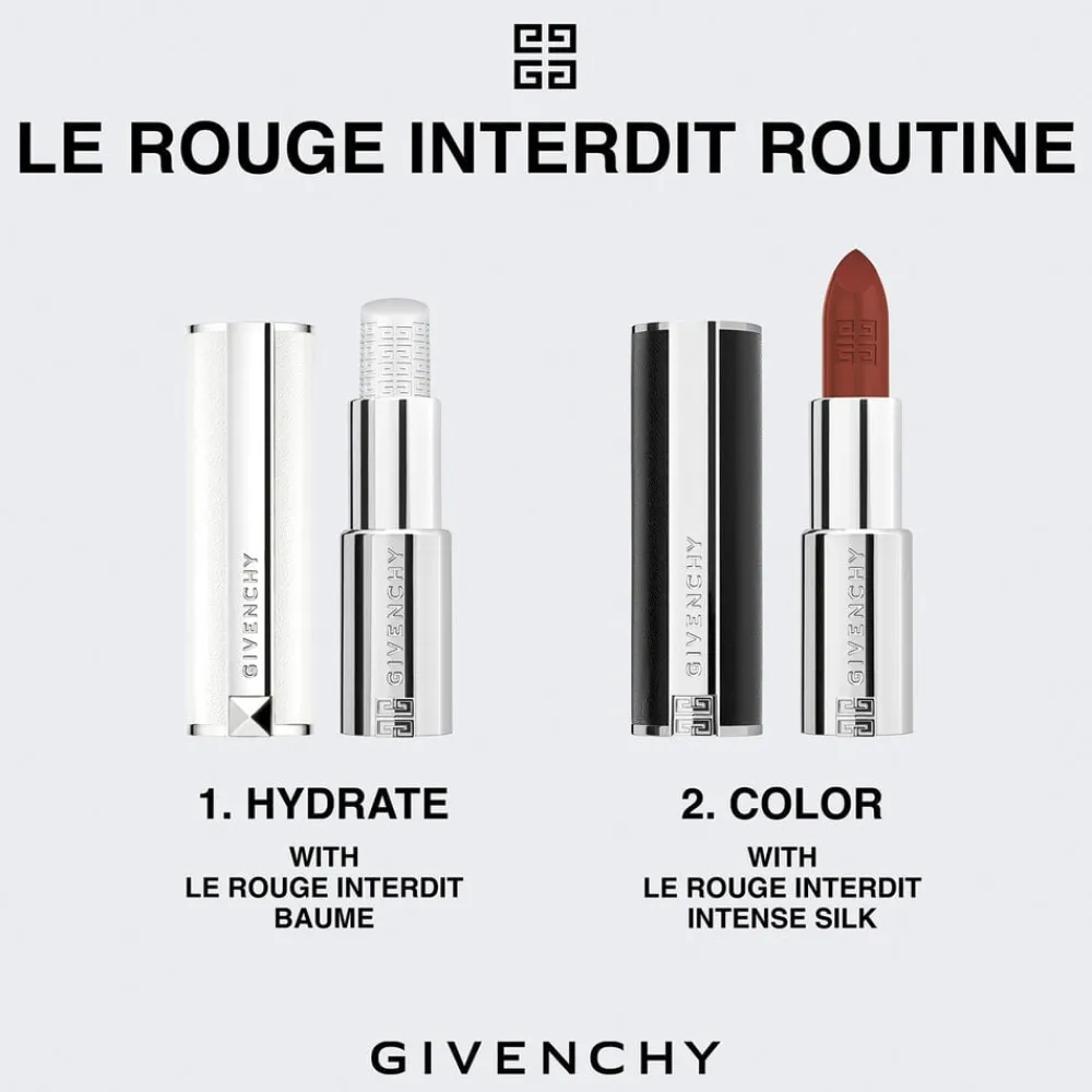 DET ULTIMATIVE MODETILBEHØRLe Rouge Interdit Intense Silk ligger i et genopladeligt læderetui og er et tidløst og elegant modetilbehør. Den moderne tekstur glider let over læberne som silke, samtidig med at den giver en lysende, halvmat finish. Og takket være formlen med kugler af hyaluronsyre og Acmella Oleracea-ekstrakt udglattes læberne øjeblikkeligt, og den indre fugt bevares i op til 24 timer for absolut komfort. Den intense farve er imponerende langtidsholdbar og forbliver levende i op til 12 timer**. Ved at kombinere en ultrafin film med den mest levende farve og ultimativ komfort omdefinerer Le Rouge Interdit Intense Silk reglerne for læbestifter. Mindre er virkelig mere! MESTEREN AF RØD Le Rouge Interdit Intense Silks højpigmenterede farvepalet fås i 25 silkebløde nuancer og indeholder de mest ikoniske og mest moderigtige røde farver. Oplev Givenchys brune signaturrød (N°37), den ultimative neutrale rød til alle (N°333) og den mest lysende rød med et strejf af gul (N°306). THOM WALKER´S VISION FOR VORES RØDE FARVER Vi har utrolige nuancer af rød, vovet rød, sofistikeret rød og pirrende rød. Vi kan forføre dig med en garderobe af røde nuancer. Rød læbestift er kraftfuld, der er aldrig et tidspunkt, hvor rød er umoderne. Det er som en sort kjole. Der er en kraft i bare at bære en rød læbestift, den klæder altid alle, ser altid fantastisk ud, og GIVENCHY tilbyder en rød farve til alle. Med rød læbestift kan du også bruge den på kinderne, det er det perfekte våben. Disse levende nuancer er opdelt i seks farvefamilier:-RED BEAN PASTE – tørrede rosa toner. -BRICK RED – gulbrune røde toner. -TOMATO RED – stærke røde toner -MAPLE RED – brune toner af rød -WINE RED – vinrød med vinrød tone-CARROT RED – orangefarvede røde toner-ROSA – bløde og levende nuancer af rosa-MILKY NUDES – naturlige rosa-beige tonerDEN MINDSTE DEL AF COUTURELe Rouge Interdit Intense Silks-æsken er lavet af ægte sort læder og har Givenchys 4G-emblem indgraveret, hvilket afspejler Matthew Williams´ nyfortolkning af logoet. Et modigt og tidløst fashion statement i alle detaljer.