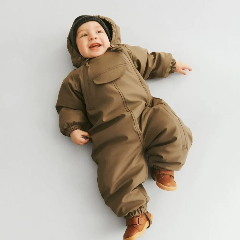 Skøn og uundværlig flyverdragt i vandtæt materiale til din baby. – Normal pasform – Aftagelig og justerbar hætte – Ribkrave – Dobbelt vindstolpe med vandtætte lynlåse – Lomme på brystkassen – Aftagelige gummistropper under fødderne – Elastik i manchetter og i benene, der lukker tæt – Reflekser Wheat’s PU dragter er en perfekt blanding mellem den velkendte regndragt og en flyverdragt. Denne dragt har en tykkere vinter polstring, som gør den varm på selv de koldeste og vådeste vinterdage. Vinterdragten er lavet i åndbart polyurethan (PU) materiale og er derfor unik, da den kan holde dit barn både tørt og varmt på én og samme tid. Dragten har mange praktiske detaljer såsom aftagelig og justerbar hætte, ribkrave og dobbelt vindstolpe. Den ene lynlås kan åbnes fra hagen og hele vejen ned til anklen. Lynlåsen i højre side kan åbnes til midt på brystkassen. Indvendigt er der en lukning over brystet med velcro, som støtter og holder dragten på plads. — Vandsøjletryk: 9. 000 mm Åndbarhed: 600 g/m2/24 t PFC-fri Florin-fri (BIONIC-FINISH® ECO) Vandtætte lynlåse Alle sømme er vandtætte og forseglet — Standard 100 by OEKO-TEX® Yder materiale: 100% Genanvendt polyester i åndbar PU (polyurethan belægning) Isolering: 100% Genanvendt polyester For: 100% Genanvendt polyester
