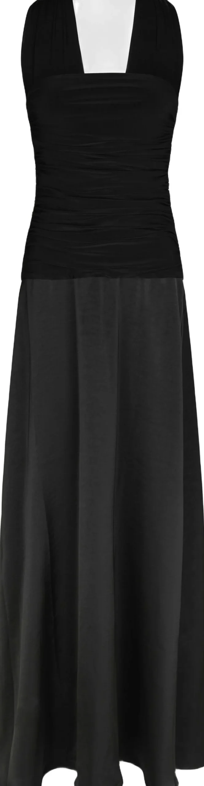 Maxi kjole med halsstrykke. Kjolens overdel er tætsiddende med rynkede detaljer, mens underdelen har vidde. Den har en dyb V-udskæring bagpå og lukkes med en skjult lynlås. Modellen er iført størrelse 36.