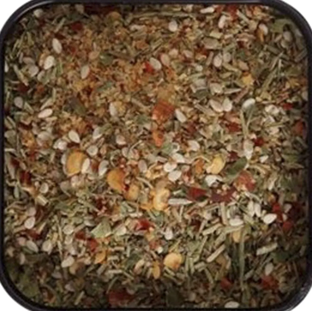 Ingredienser: Hvidløgsgranulat, rosmarin, hvid sesam, chiliflager, sar, oregano, timian, basilikum.