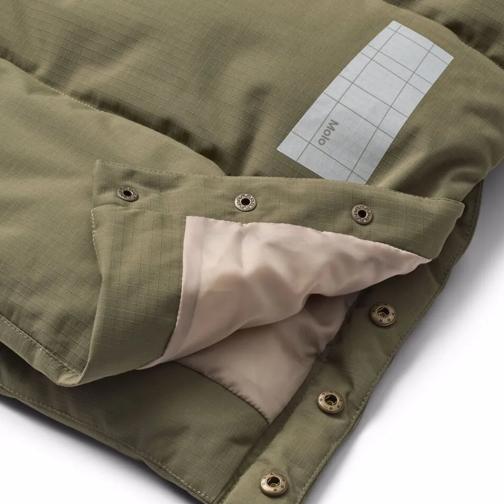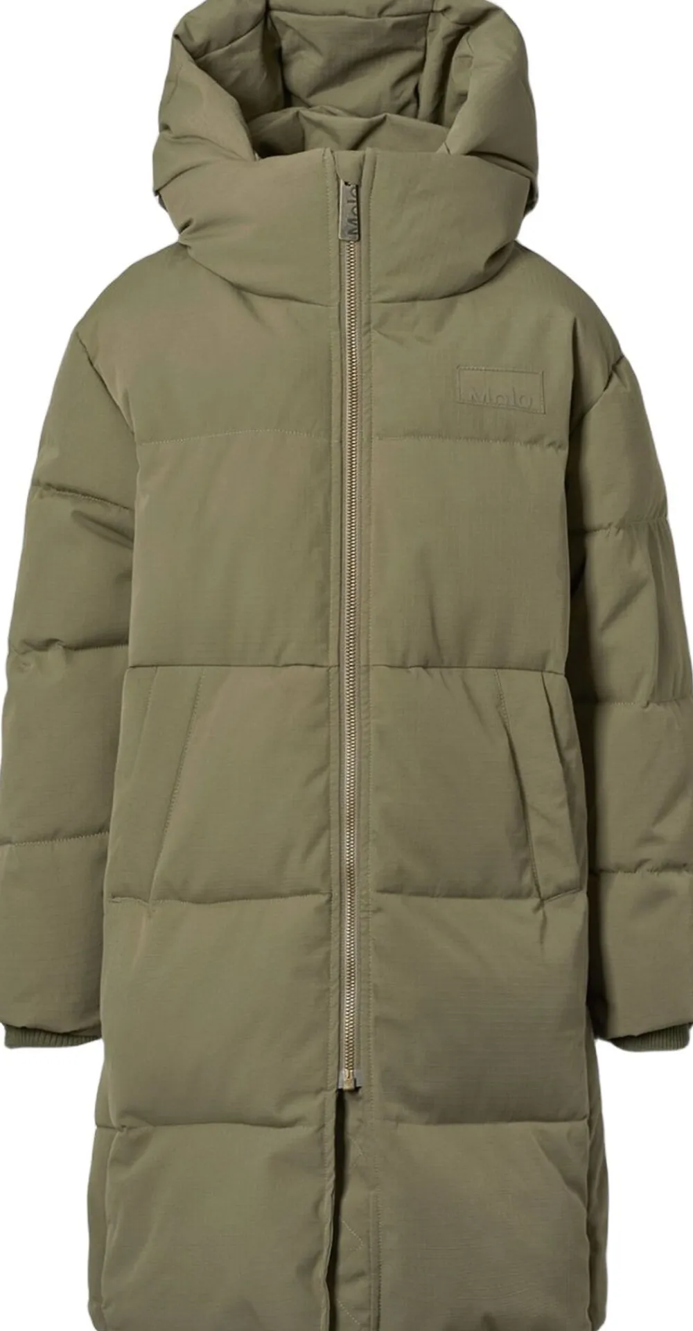 Denne army grønne jakke fra Molo er lavet i genanvendt nylon og har en praktisk lynlåslukning, høj krave og aftagelig hætte. Jakken har en længde til over knæet og er designet med frontlommer, en indvendig lomme samt ribkant ved håndleddene. Høje slidser med trykknapper i begge sider sikrer stor bevægelsesfrihed og gør jakken praktisk når du skal cykle. Bagpå er der en stor refleks.