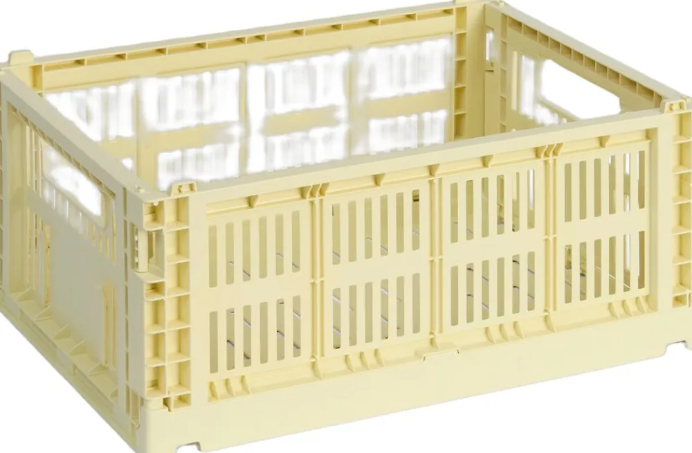 HAY Color Crate er en serie af farverige opbevaringskasser med et karakteristisk, perforeret design. Kasserne er lavet af 100% genanvendt plastaffald i en række forskellige farver og størrelser, og kan stables oven på hinanden i forskellige størrelseskombinationer. De multifunktionelle kasser er velegnede til at opbevare og organisere en lang række genstande på hylder, borde eller inde i skabe.