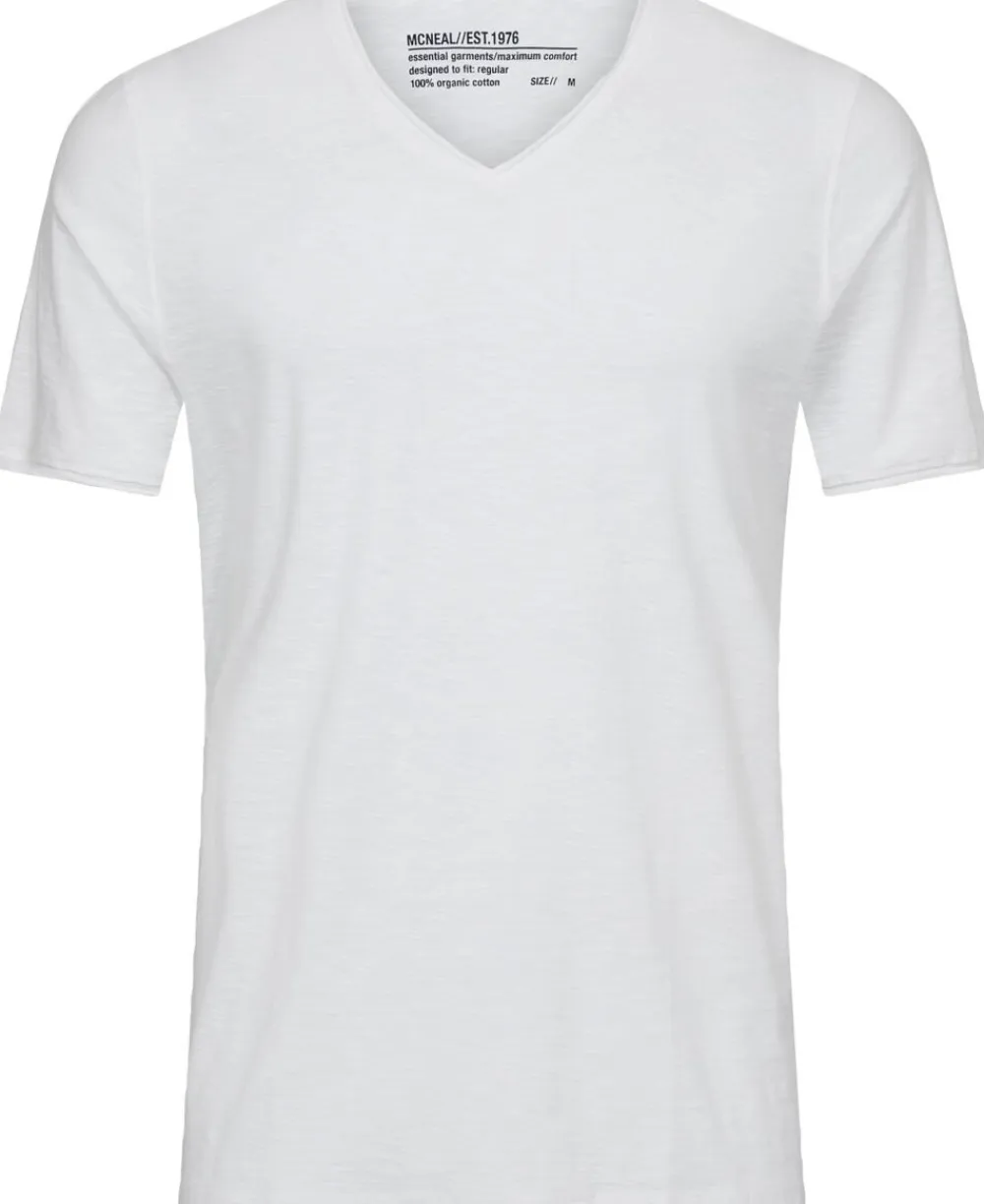 T-shirt fra McNeal i en blød kvalitet af 100% økologisk bomuld. T-shirten er enkel i modellen med korte ærmer, V-udskæring, rullekanter samt ‘Regular Fit’. En casual T-shirt i den lækreste kvalitet.