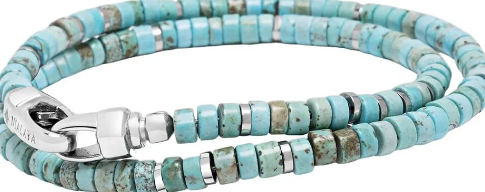 Herre turkise Heishi Wrap armbånd, 4 mm turkise Heishi perler, låse og perler i 316L rustfrit stål. Håndlavet i Los Angeles