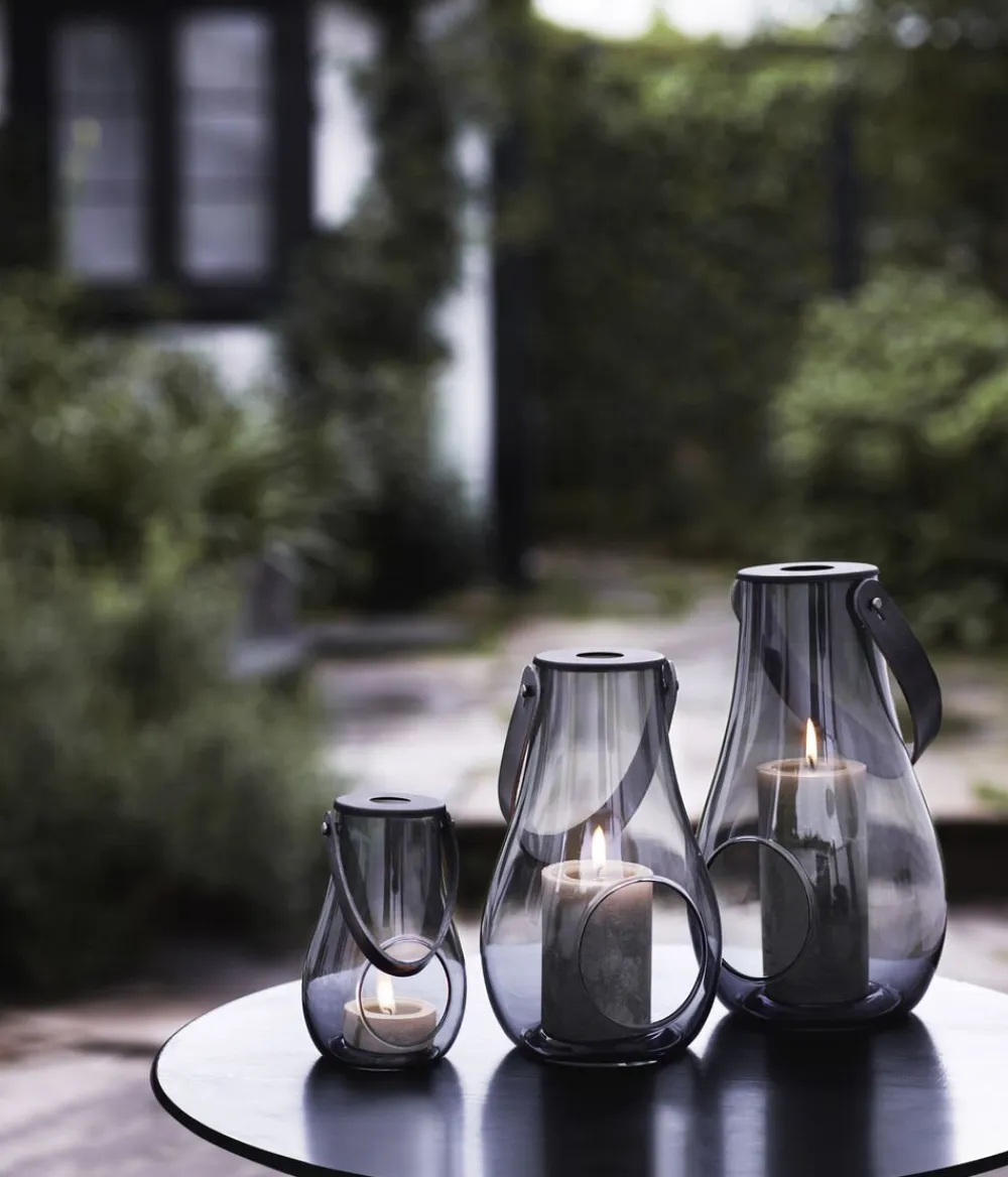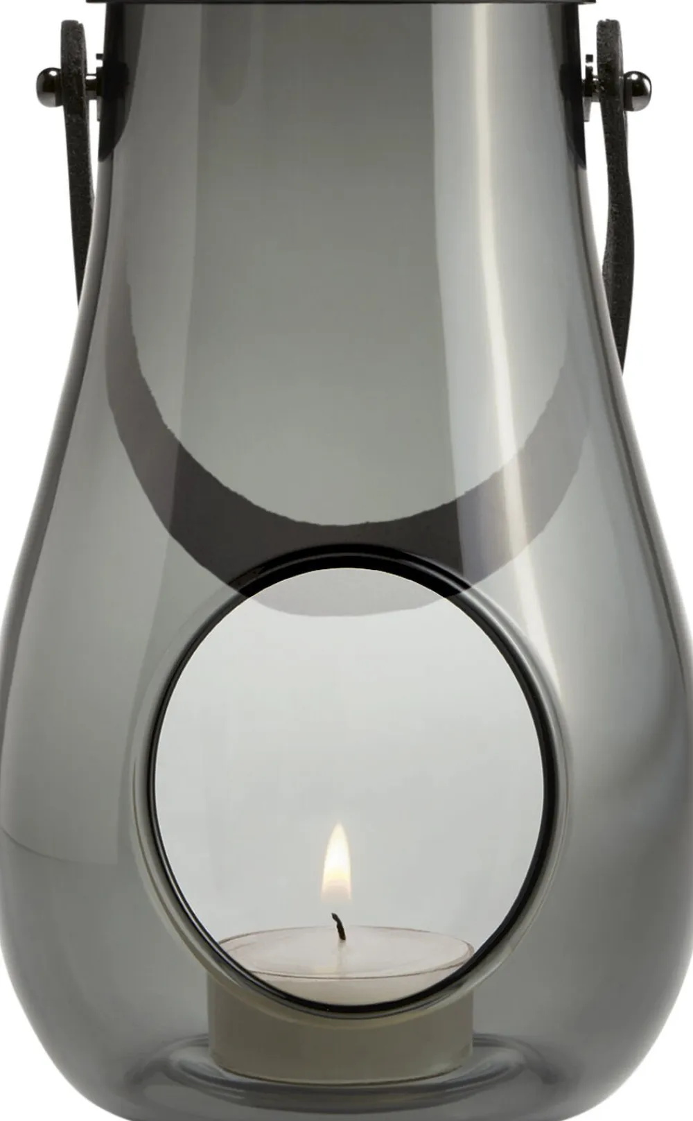 Brug Design With Light-lanternen året rundt både ude og inde. Lanternen er suveræn til sommeraftener på terrassen eller som dekoration på gulv, bord, trappe eller i vinduet. Kun fantasien sætter grænser. Designer Maria Berntsen har skabt den mobile lyskilde i smoke-farvet glas og kernelæder, der spreder lys og hygge i den bedste, skandinaviske ånd. Da glasset er mundblæst, er hver enkelt lanterne helt unik. Denne lanterne måler 16 cm i højden, men lanternen findes også i versioner på henholdsvis 25 cm og 29 cm. Lanternerne fås i smoke, som vist på denne model, samt i klart eller i frostet glas, og de enkelte modeller kan med fordel kombineres.