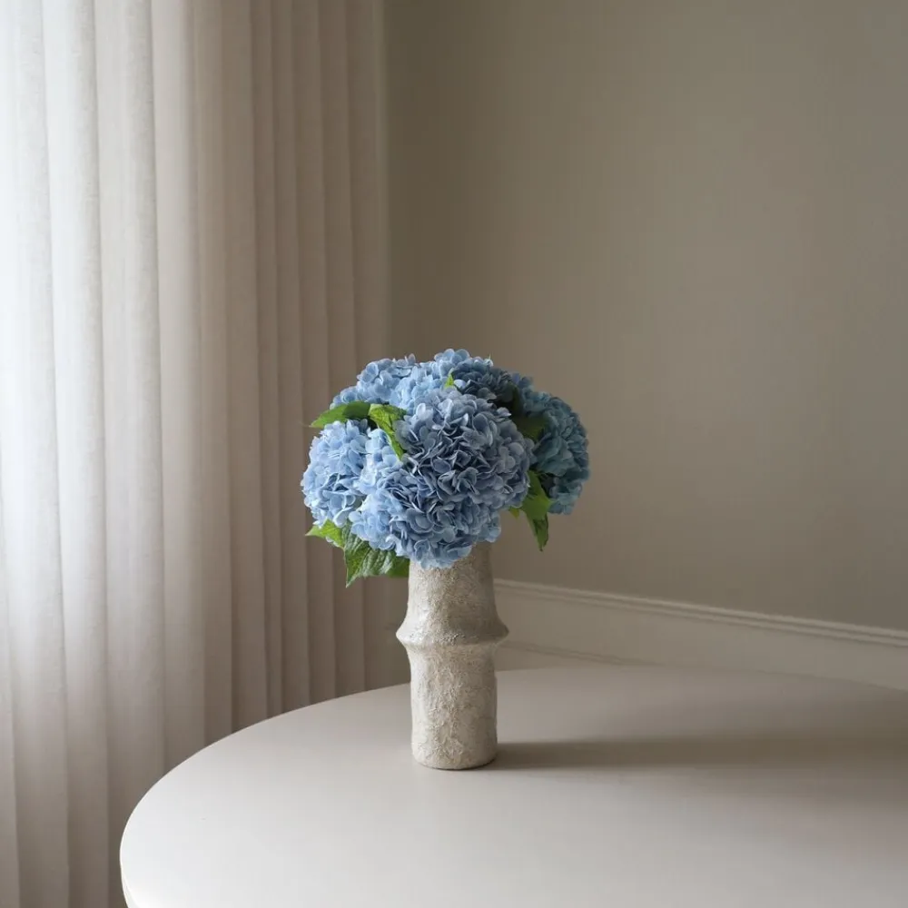 Denne buket viser en dyb, rig blå palet med fulde, afrundede blomster. Svampehydrangeas i livlige blå nuancer skaber et voluminøst og struktureret arrangement. Denne buket indeholder i alt 7 stilke. Bomet når en højde på 49 cm på sit højeste punkt, men alle skafter kan let bøjes og justeres for at opnå den ønskede højde og form til ethvert arrangement. Den store keramiske jordvase på billedet måler 30,5 cm i højden og 10 cm i diameter.