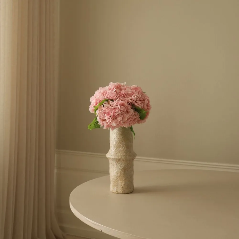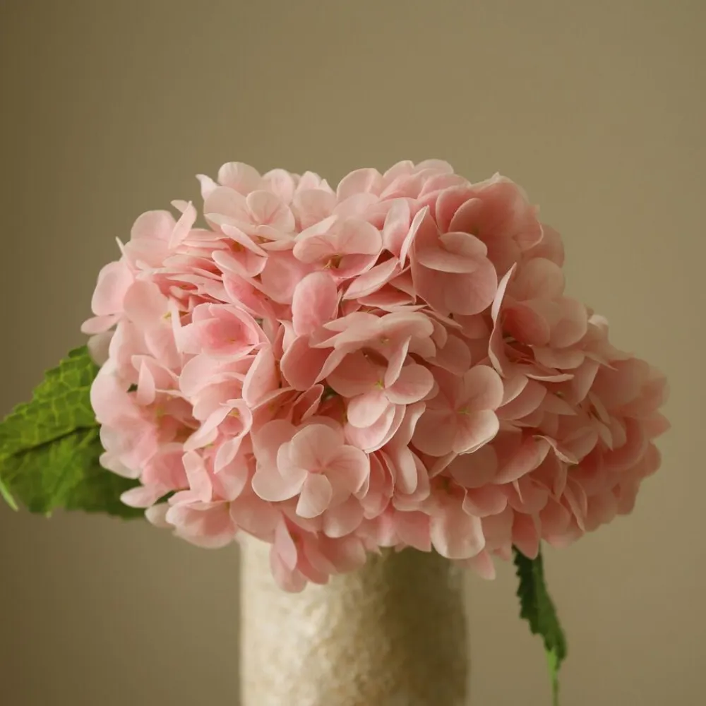 Denne lyserøde Hydrangea blomsterstamme har en Single stor blomst med bløde, pastelrøde kronblade, der danner en tæt, afrundet klynge. Kranserne viser subtile variationer i nuance, hvilket skaber en naturlig gradienteffekt. Blomsten er ledsaget af teksturerede, dybe grønne blade med savtakkede kanter, fastgjort til en robust, lysegrøn stilk og når en højde på 49 cm. Den store keramiske jordvase på billedet måler 30,5 cm i højden og 10 cm i diameter.