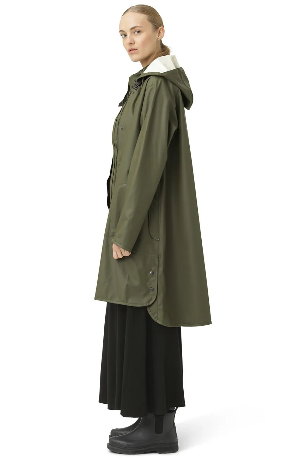 Vandtæt – W/P 5000 MM Gummieret PU-stof med trikot på bagsiden Blød og let kvalitet Sidelommer med klap Justerbare manchetter Stolpelukning med 2-vejs lynlås og skjulte trykknapper Svejsede sømme Aftagelig hætte Slidser i siderne med trykknapper for bedre bevægelighed Denne A-formede regnfrakke fra ILSE JACOBSEN HORNBÆK er en moderne fortolkning af den klassiske regnfrakke med løs pasform og detaljer, der gør den velegnet til brug året rundt. Bare tilføj en trøje eller et quiltet lag under den, når temperaturen falder! Regnfrakken er fremstillet i et let og raffineret, vandfast gummieret PU-materiale med trikot på bagsiden, der gør regnjakken ekstremt behagelig at have på. Regnfrakken har stolpelukning med 2-vejs YKK-lynlås og skjult trykknaplukning. Desuden er alle sømme svejsede for at gøre dem 100% vandfaste, så du ikke behøver at bekymre dig om, at der trænger vand ind, eller at du bliver våd. Ikke desto mindre er RAIN71 meget mere end bare en regnfrakke. Denne model har en aftagelig hætte, der er fastgjort med en vandfast strop i kunstlæder, to store sidelommer og justerbare manchetter med et lille logo på venstre ærme for perfekt pasform. Frakken er som skabt til regnvejrsdage. Uanset om du går tur, lufter hunden eller er ude at fiske, holder RAIN71 dig tør. Den er desuden ideel til cykelturen, da slidserne i siderne med trykknapper langs siderne muliggør ekstra bevægelse. Du kan vælge mellem to forskellige længder, afhængig af hvor høj du er, og et udvalg af såvel klassiske farver som sæsonfarver. Med RAIN71 kan du altid finde en regnfrakke, der passer til dig og resten af din garderobe. Materialer: 100% polyesterjersey med PU-overflade Funktionalitet: W/P 5000 MM Længde foran fra højeste punkt på skulderen: 94 cm Ryglængde fra højeste punkt på skulderen: 103 cm (str. 38)